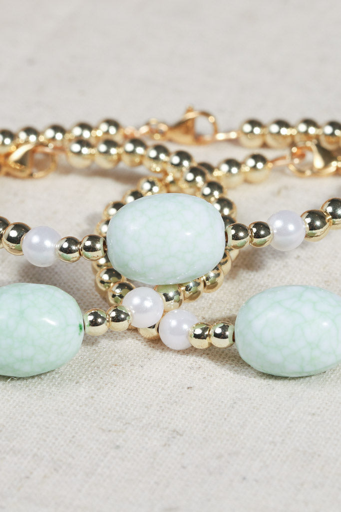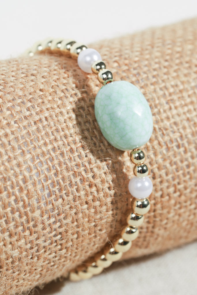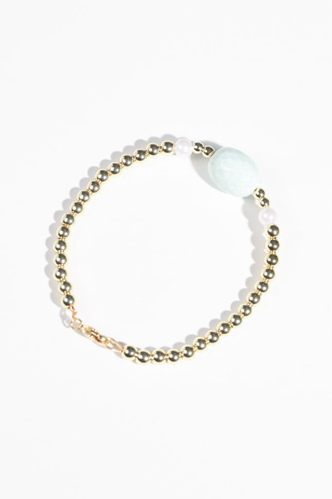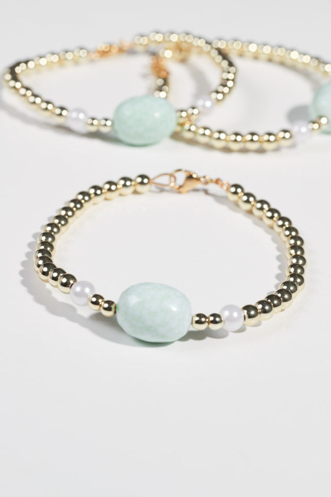 Fresh and playful, this bracelet adds a pop of color to your stack with its standout mint green focal bead. Balanced with 14k gold fill beads and lustrous faux pearls, it’s the perfect mix of elegance and fun.