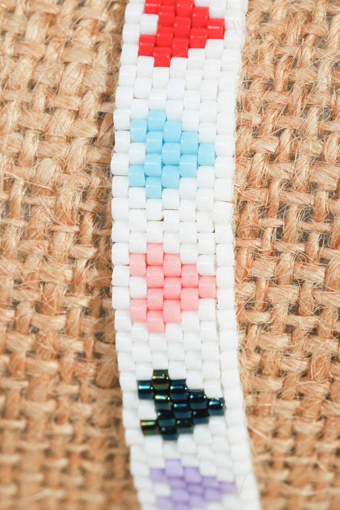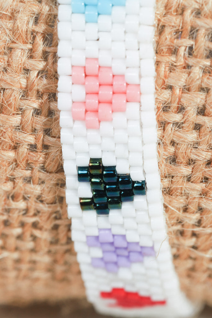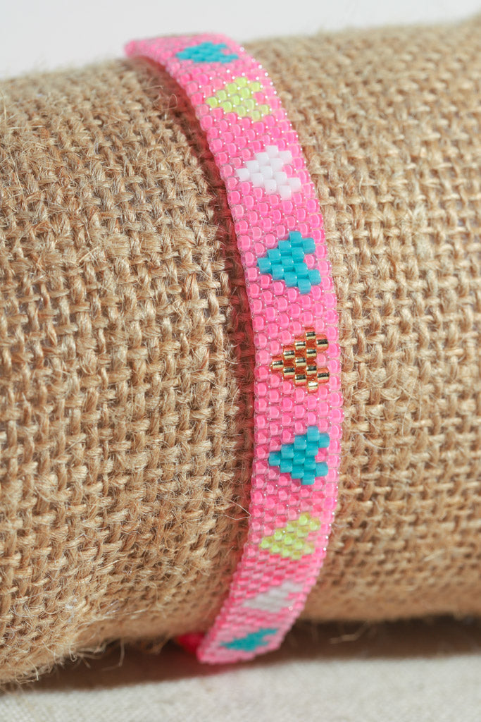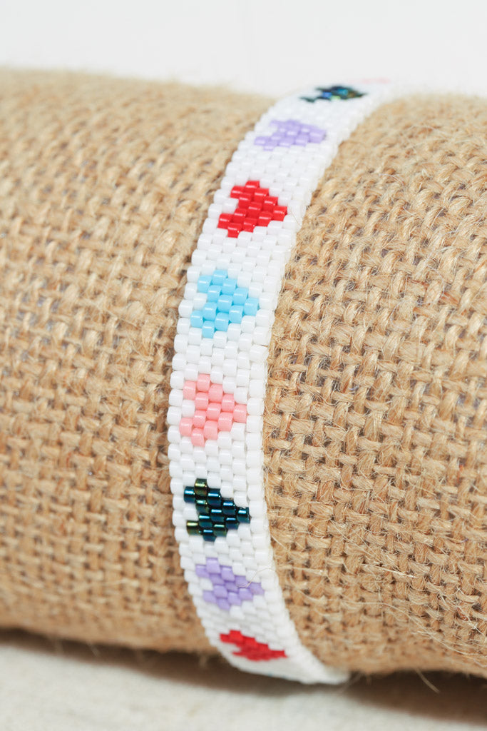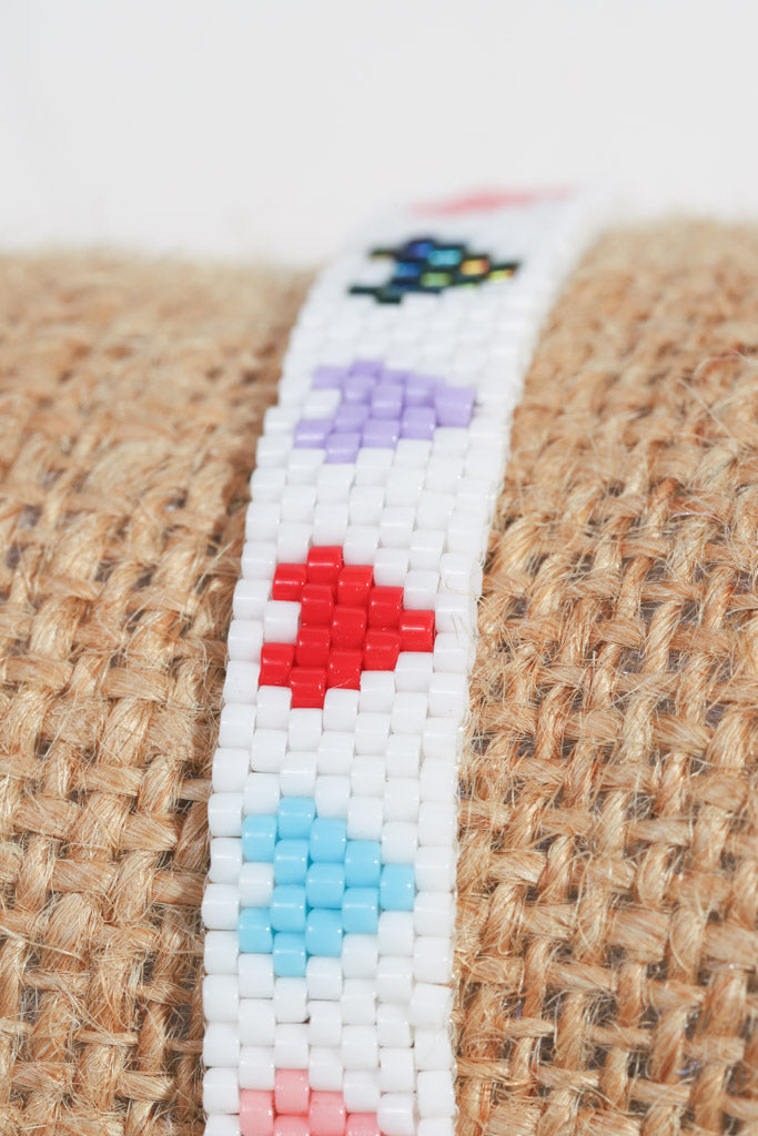 Handwoven with luminous white and Neon pink Miyuki seed beads. The white bracelet is adorned with delicate heart motifs in red, lavender, light blue, pink, and black — each symbolizing love in a different shade. Its clean, minimal design pairs beautifully with both casual and elevated looks, whether worn alone or stacked. The neon pink bracelet has light blue, gold, yellow and white hearts.