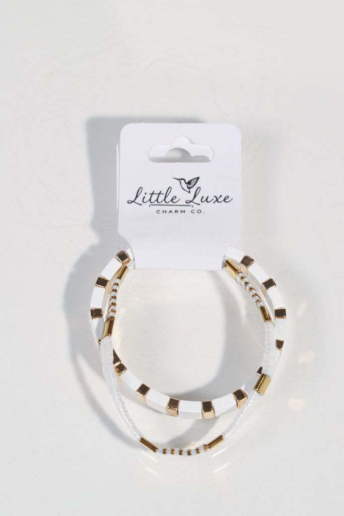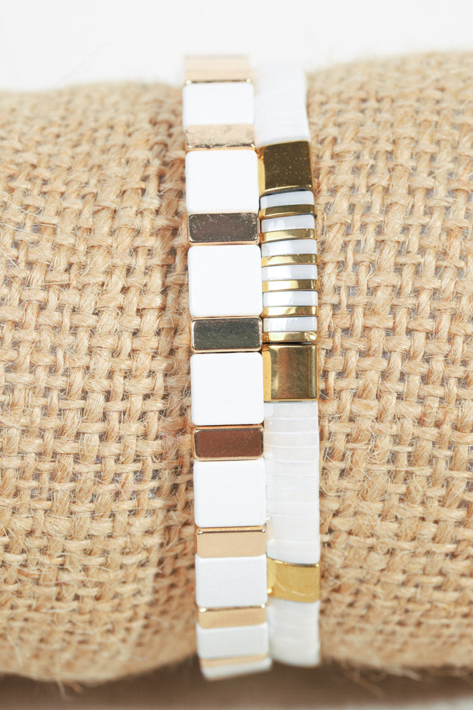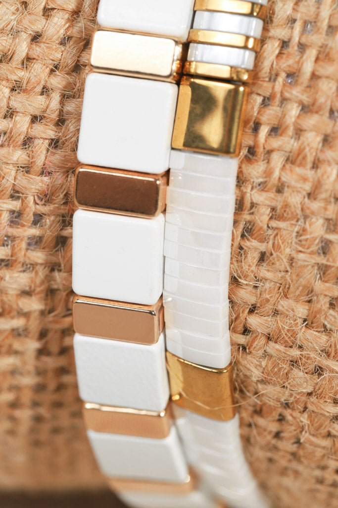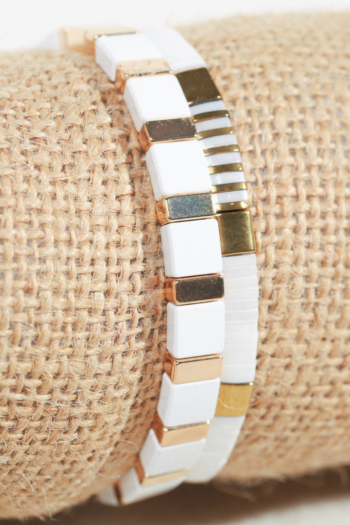 Sleek, modern, and effortlessly chic — this two-bracelet stack is designed to elevate your everyday look. Featuring glossy white and radiant gold tile beads, each bracelet adds a touch of understated luxury while still keeping things playful and versatile.