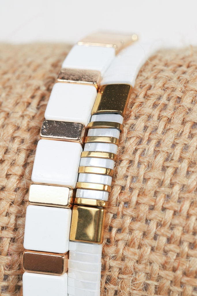 White and Gold Tile Bead Bracelet Stack