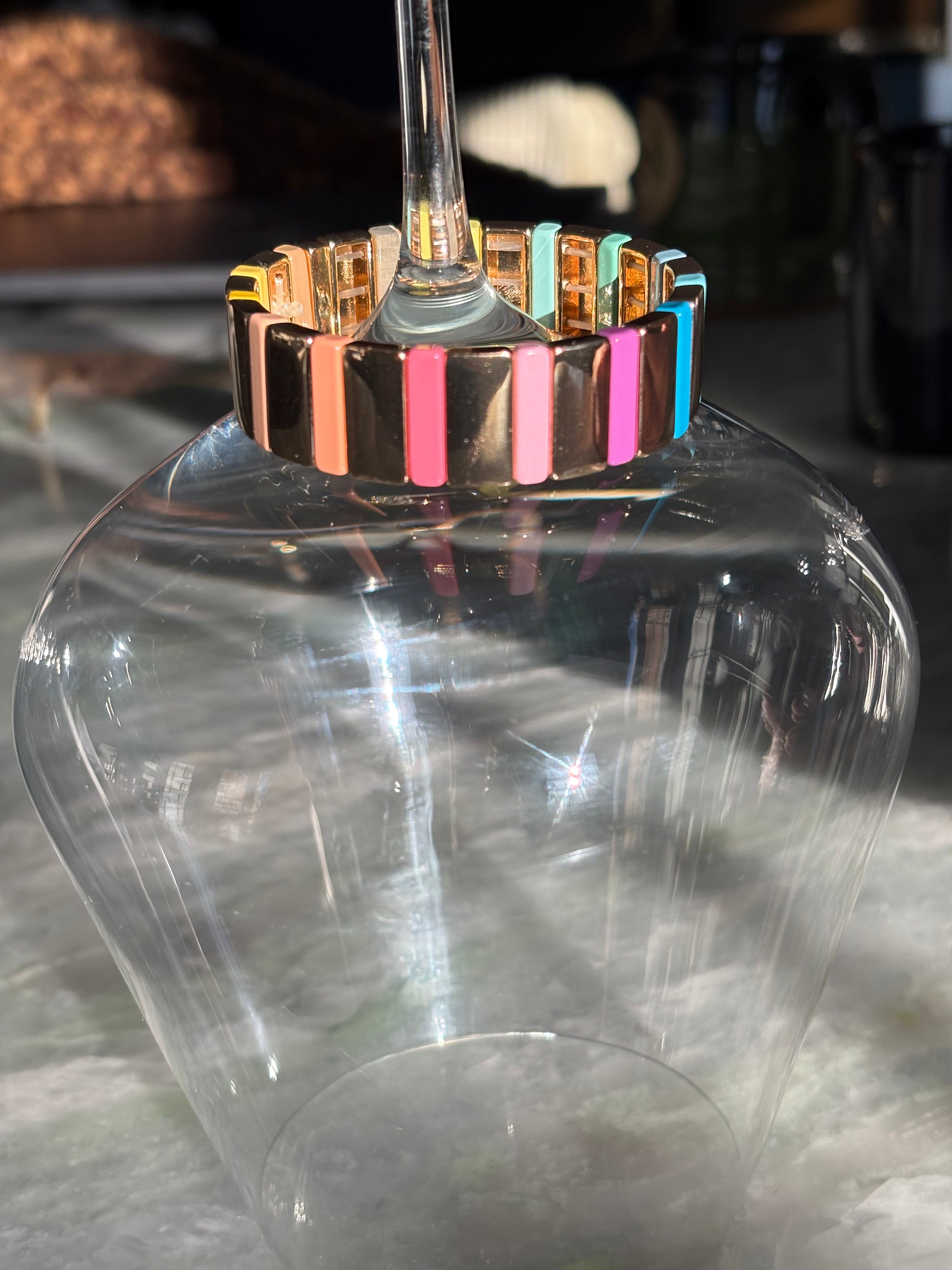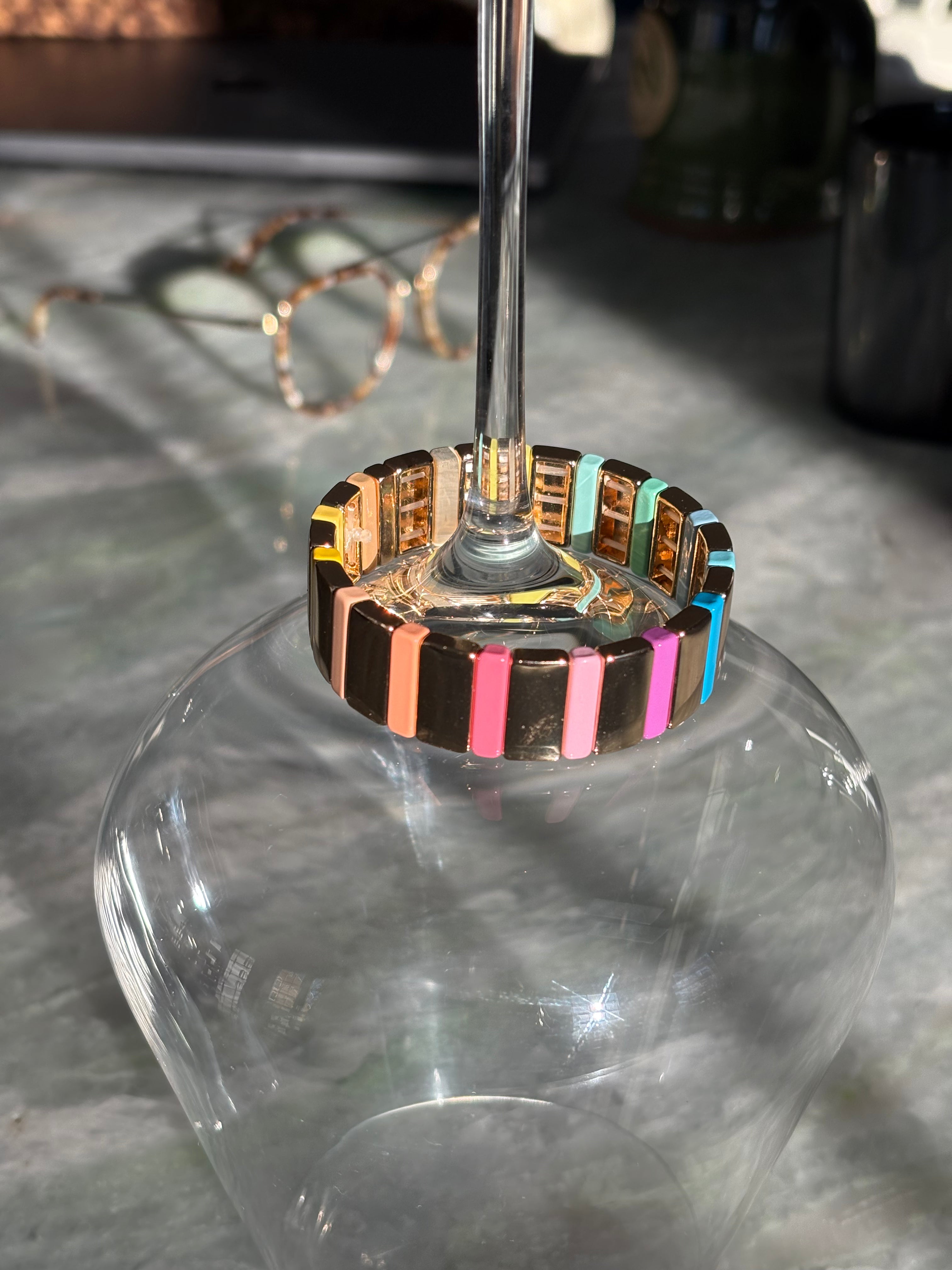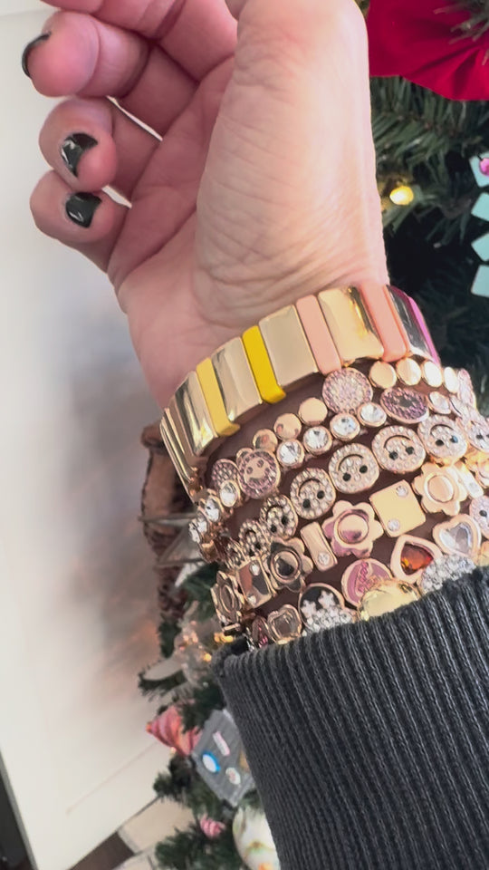 Wide band, golden rainbow bracelet. Stretchy!  Fits wrist size 6 1/2 inches to 7 1/2 inches.  Super cute!  Non Tarnish and waterproof. Looks so cute in a gold stack, a beaded bracelet, stack or worn alone as a statement.  So comfortable on the wrist and very lightweight!  Can swim, shower, and sleep in this bracelet!