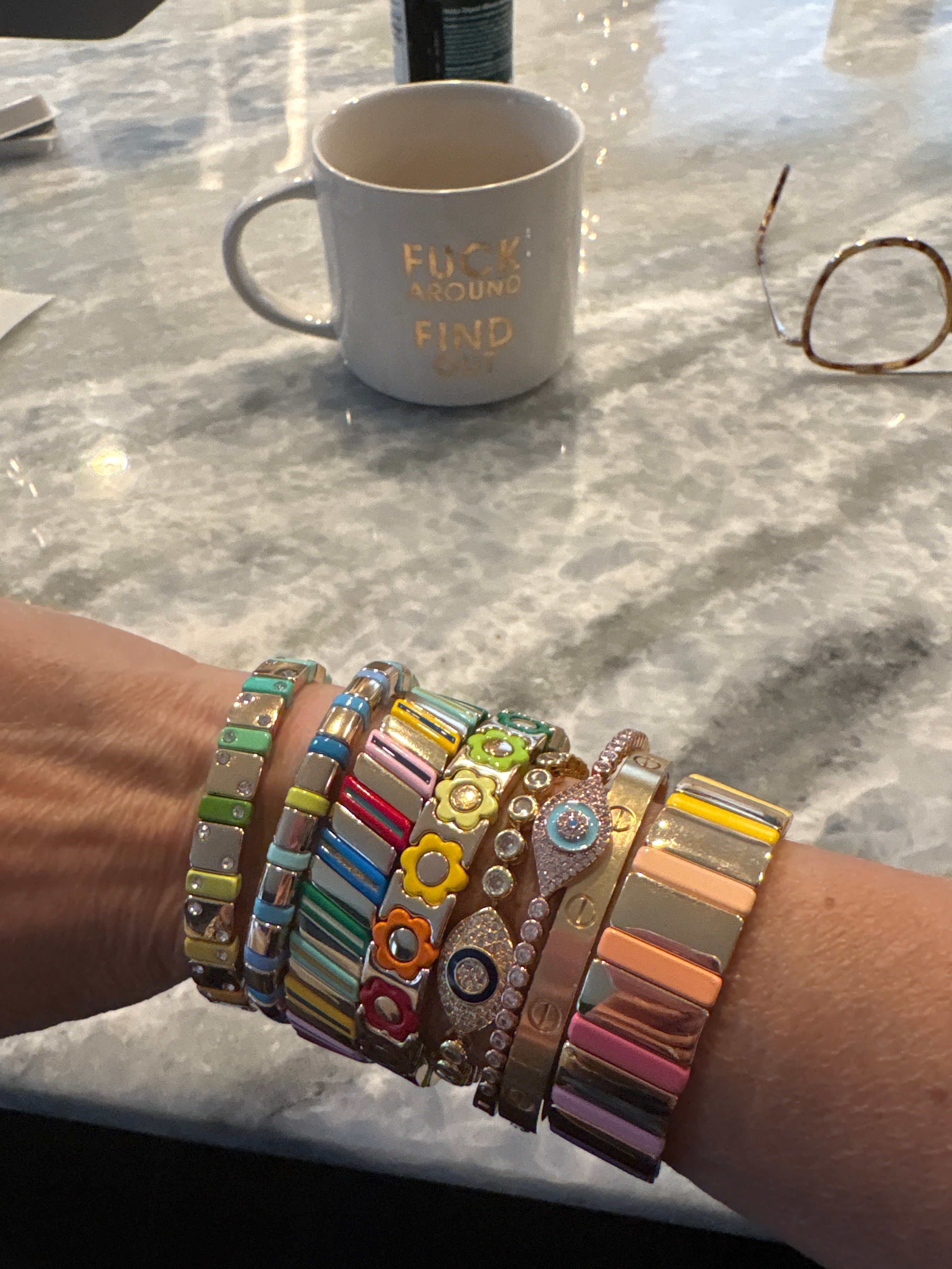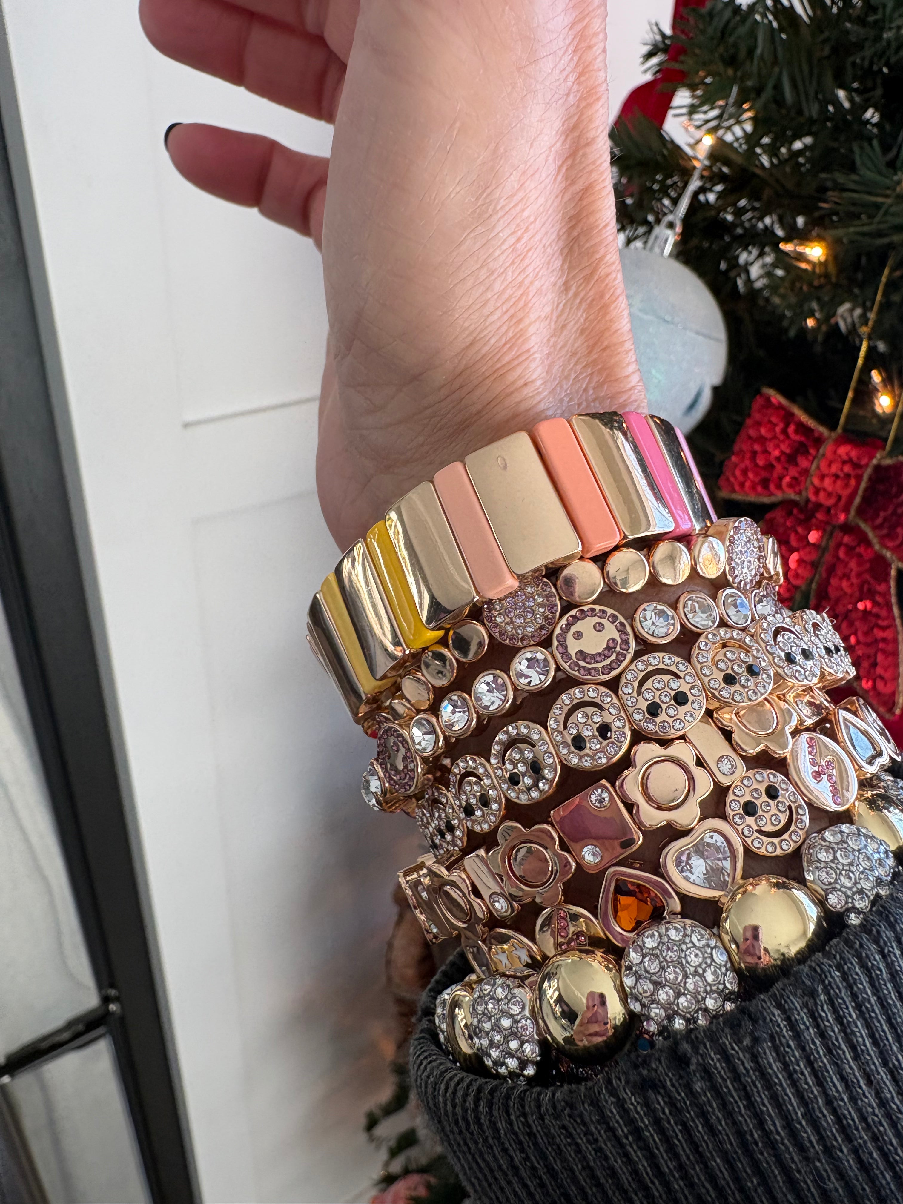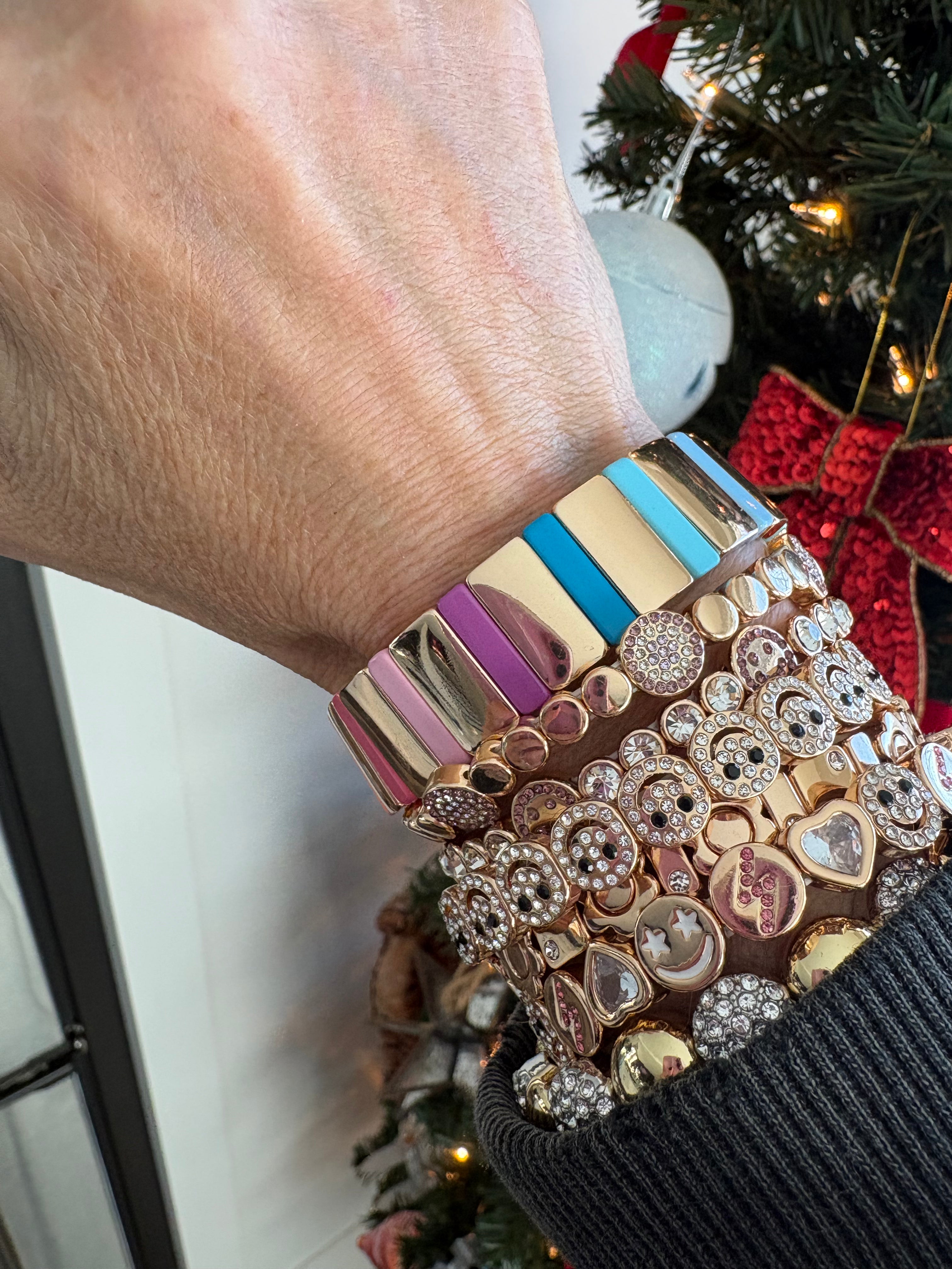 Wide band, golden rainbow bracelet. Stretchy!  Fits wrist size 6 1/2 inches to 7 1/2 inches.  Super cute!  Non Tarnish and waterproof. Looks so cute in a gold stack, a beaded bracelet, stack or worn alone as a statement.  So comfortable on the wrist and very lightweight!  Can swim, shower, and sleep in this bracelet!
