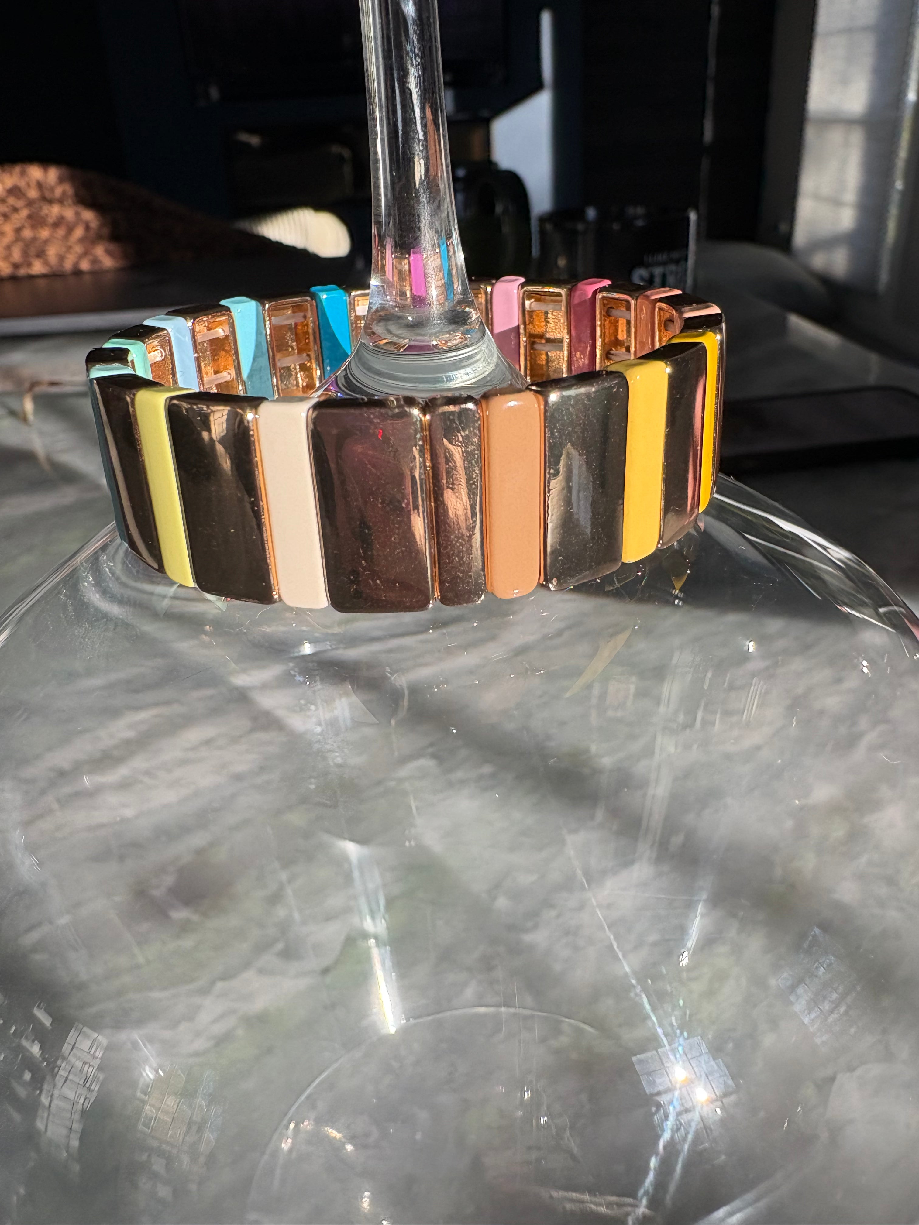 Wide band gold rainbow stretch bracelet.
