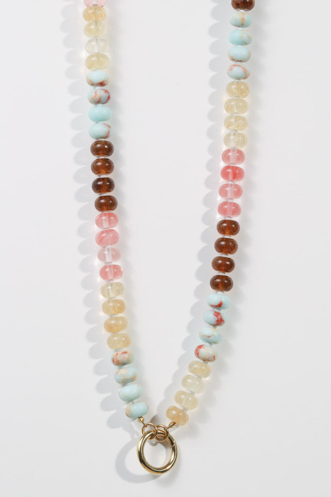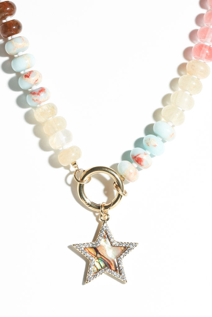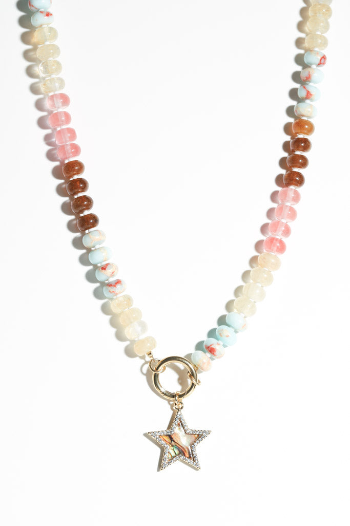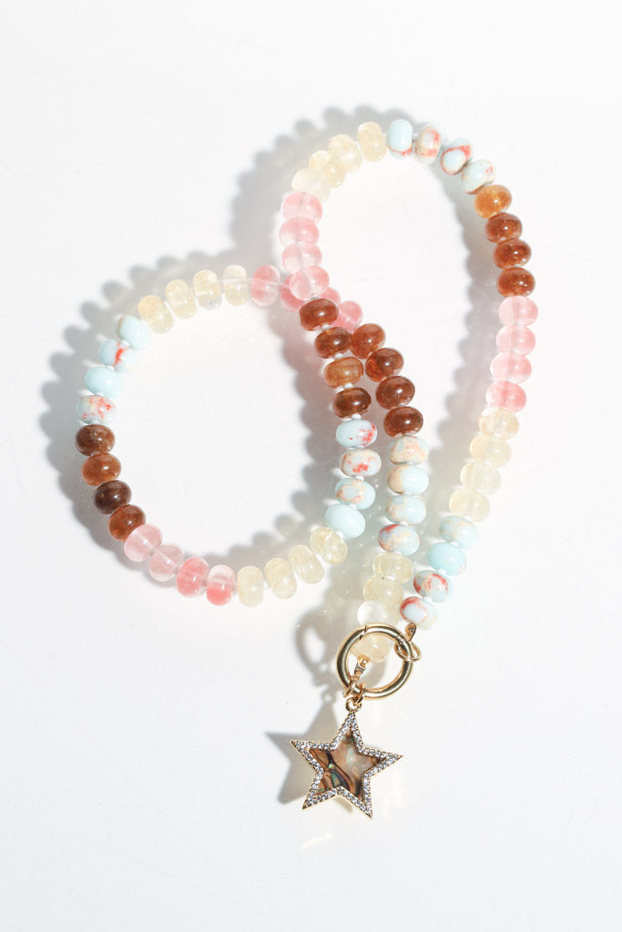 Sweet and subtle, this 16" necklace is strung with pastel rondelle beads in soft shades of light pink, pale turquoise, brown, and cream with a mother of pearl and crystal star charm—reminiscent of Neapolitan ice cream with a fresh, cosmic twist