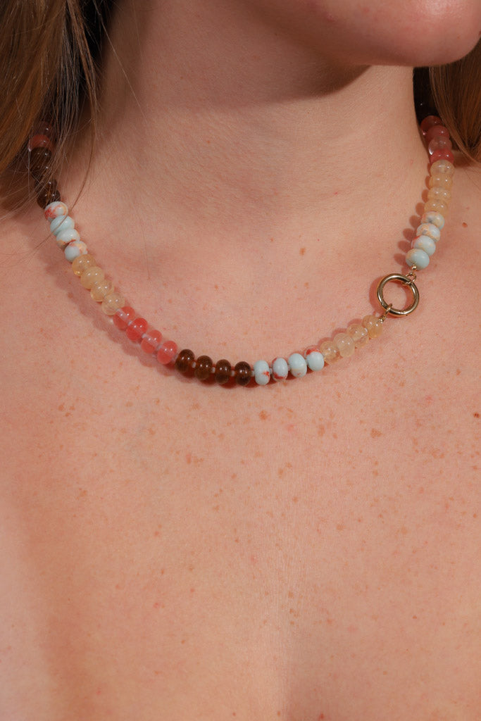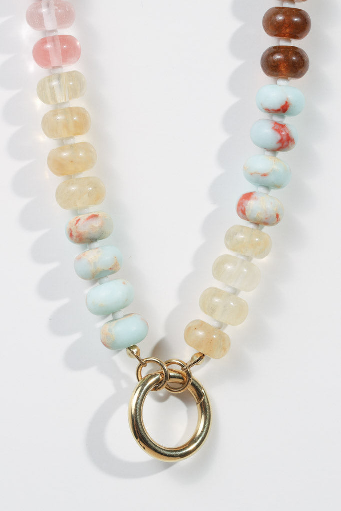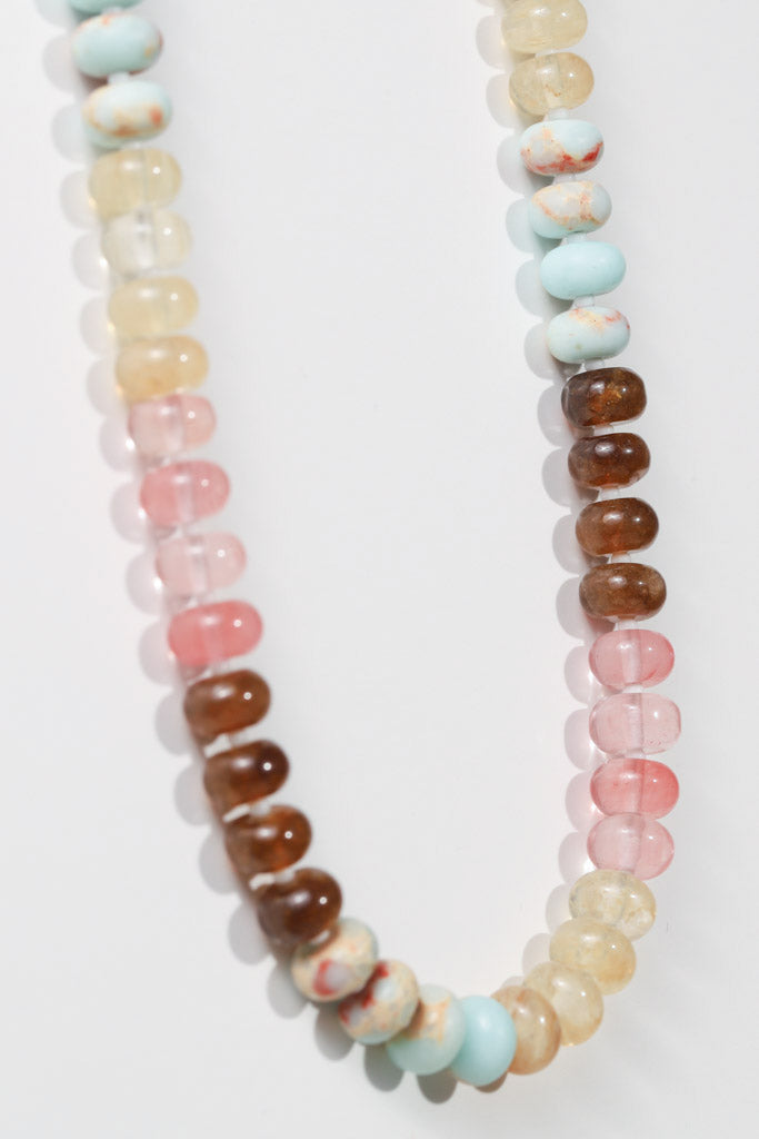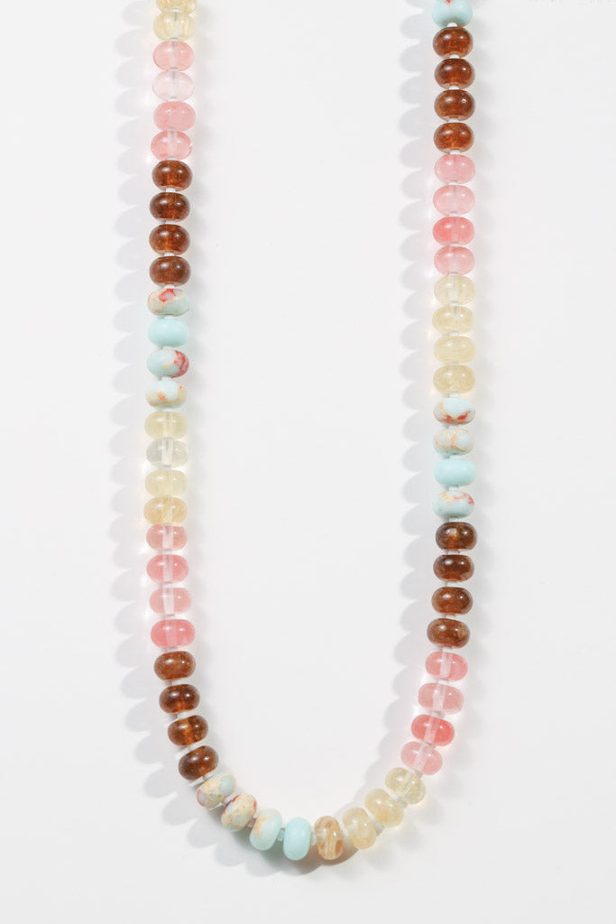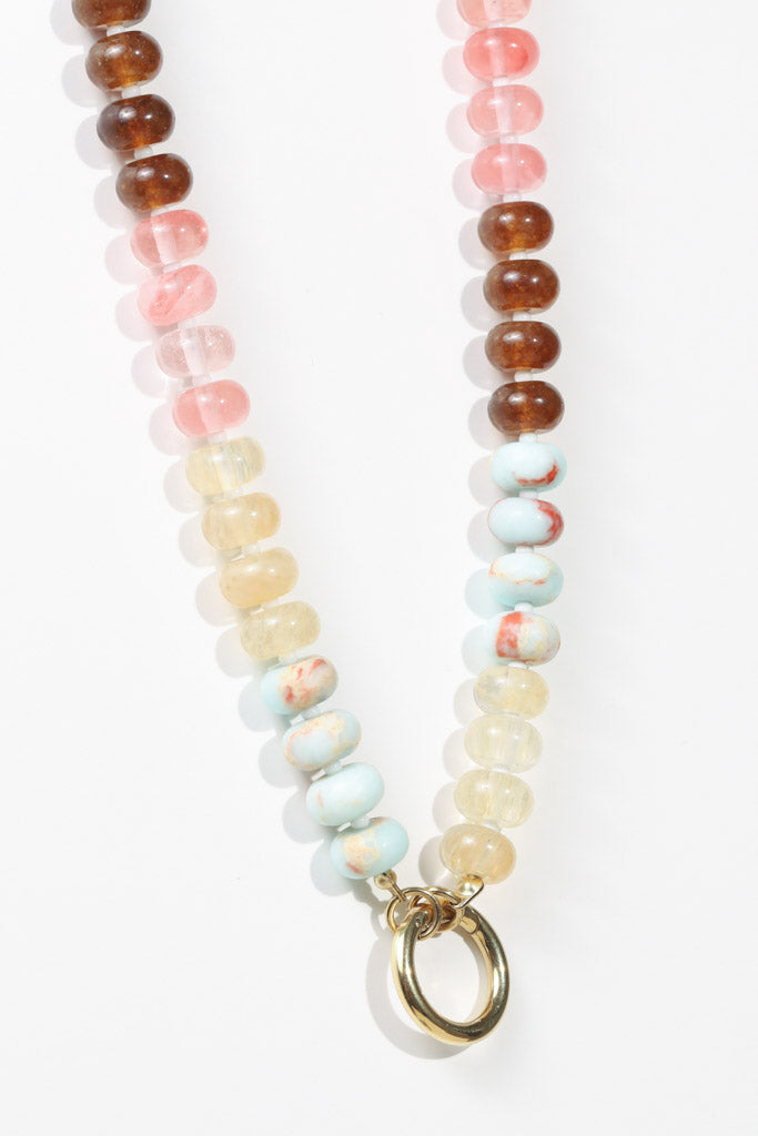 Sweet and subtle, this 16" necklace is strung with pastel rondelle beads in soft shades of light pink, pale turquoise, brown, and cream with a mother of pearl and crystal star charm—reminiscent of Neapolitan ice cream with a fresh, cosmic twist