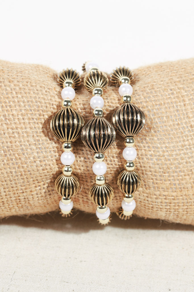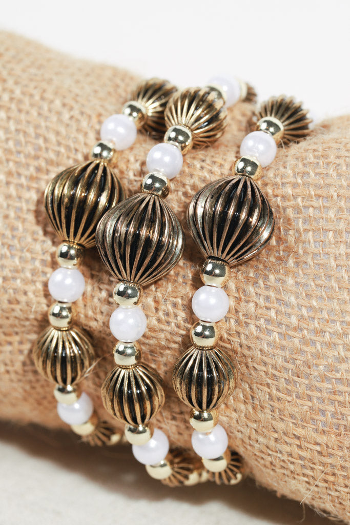 Delicate yet eye-catching, this 4mm gold beaded bracelet features a unique mix of textures with three larger lantern-style gold and black beads and two smaller accent beads that resemble Chinese lanterns or hot air balloons inlcuding three pearl accent beads. The design gives the bracelet a playful elegance, making it perfect for everyday wear or stacking with other favorites. (This listing is for ONE bracelet only)