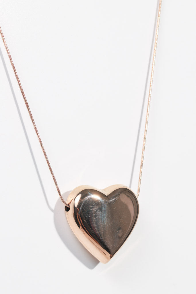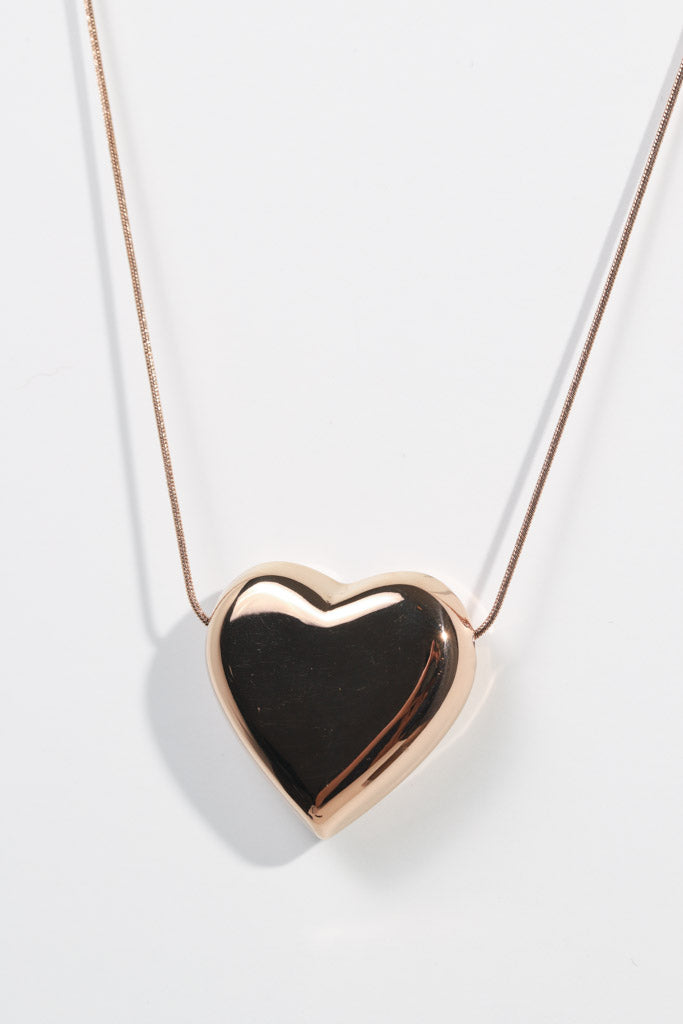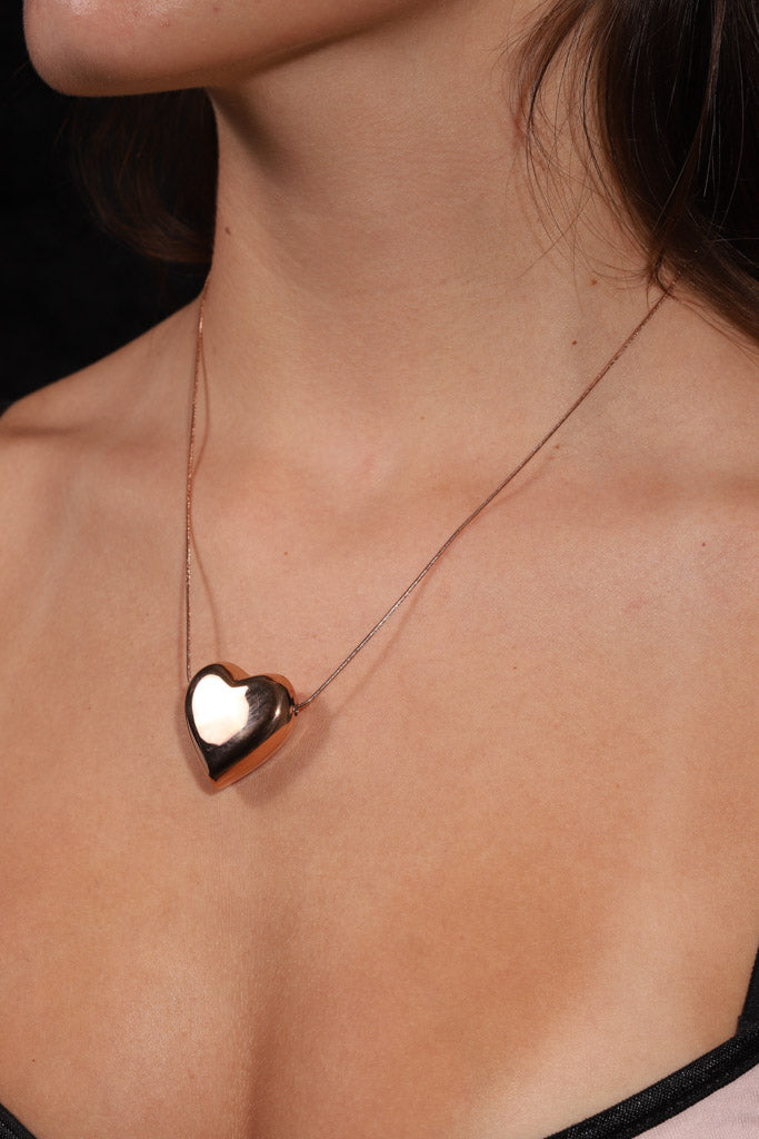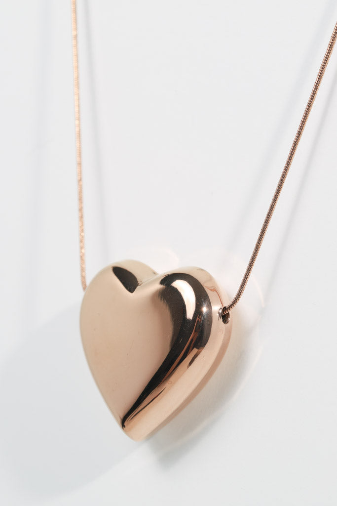 Bold yet romantic, this statement heart necklace features a large, chunky rose gold heart pendant on a sleek 16"-18" rose gold snake chain. Crafted with rose gold plating over stainless steel, it offers lasting shine and durability while keeping its modern, polished look. Perfect for adding a touch of love-inspired drama to your outfit—wear it with a crisp white shirt, a silky blouse, or your favorite little black dress.