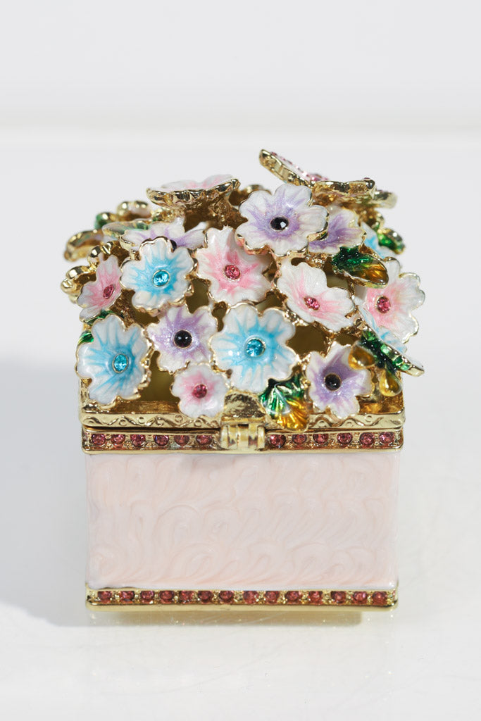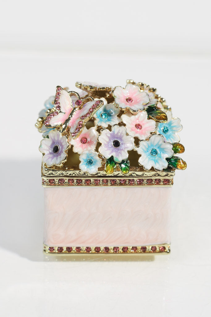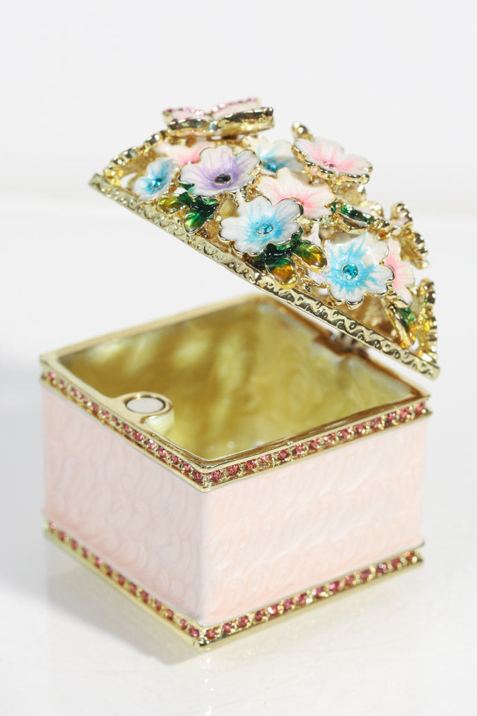 Charming and feminine, this petite square jewelry box is the perfect blend of beauty and function. Finished in glossy pink enamel, the lid is adorned with a delicate cluster of enamel flowers in soft shades of pink, blue, and purple, with pink butterfilies creating a timeless, romantic look.