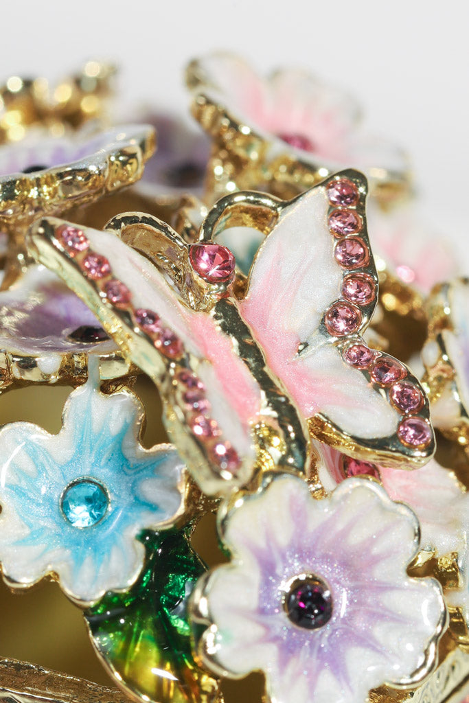 - Floral cluster lid in pink, blue, and purple enamel with pink butterflies