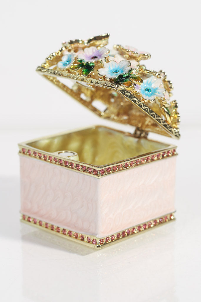 Square Pink Enamel Jewelry Box with Floral Cluster