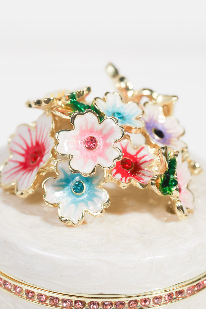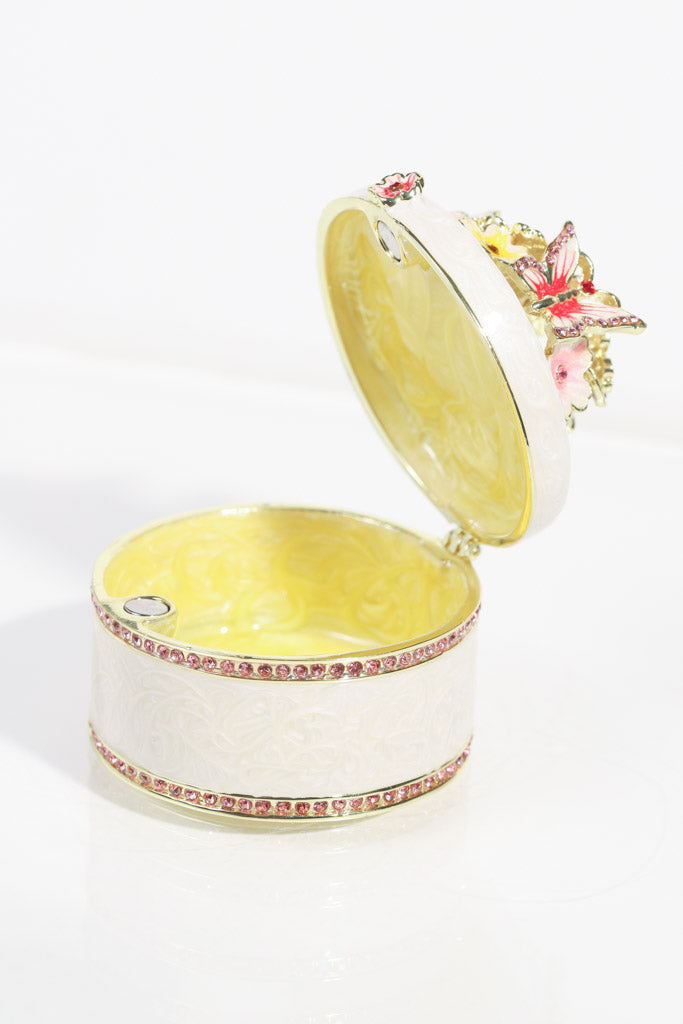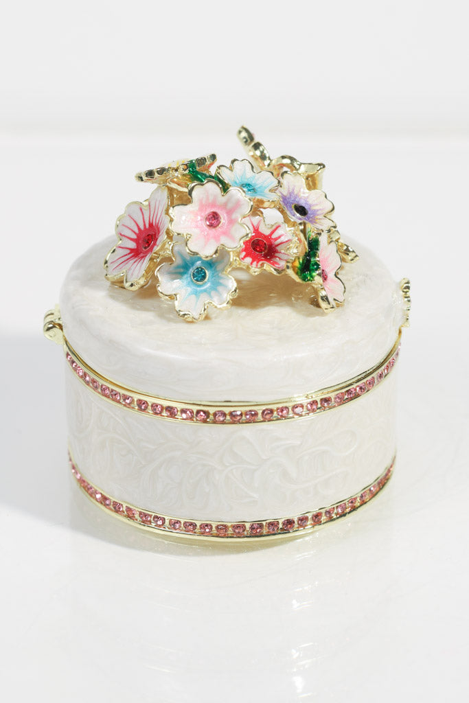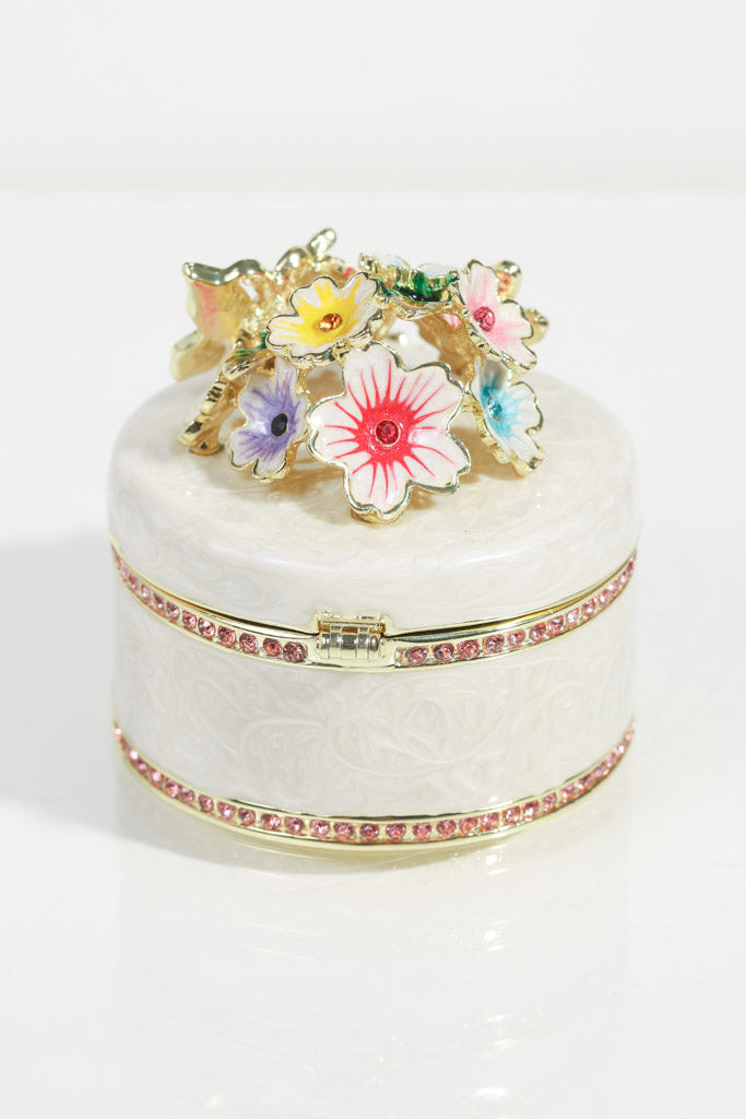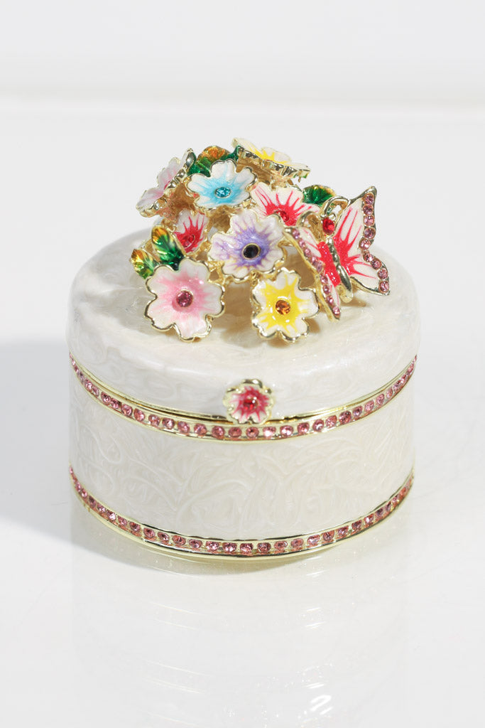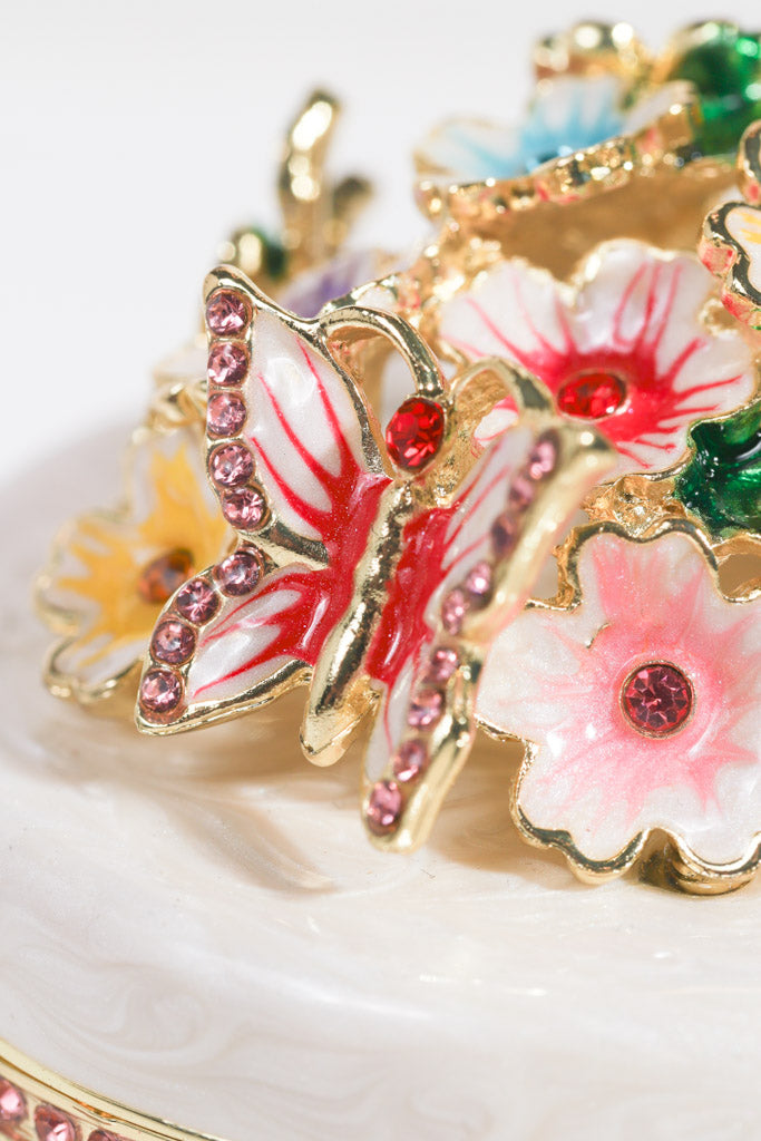 The lid is adorned with a bouquet of multi-colored enamel flowers in turquoise, yellow, pink, purple, and red, crowned with a graceful red and white enamel butterfly whose wings are elegantly trimmed in sparkling pink crystals. The result is a vibrant, heirloom-style piece that feels both whimsical and timeless.