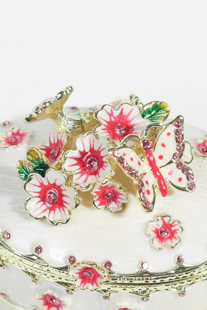 The box is adorned with delicate hot pink enamel flowers, carried onto the lid where they surround a graceful white and hot pink enamel butterfly. A border of pale pink crystals trims both the lid and the base, adding a soft, elegant sparkle that catches the light beautifully.
