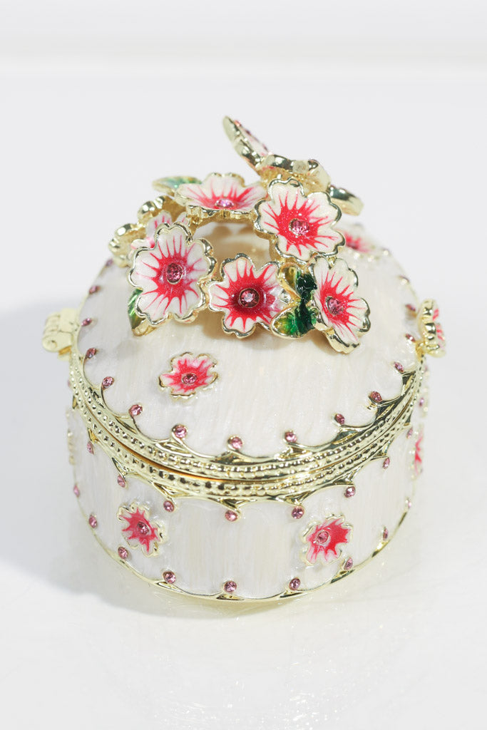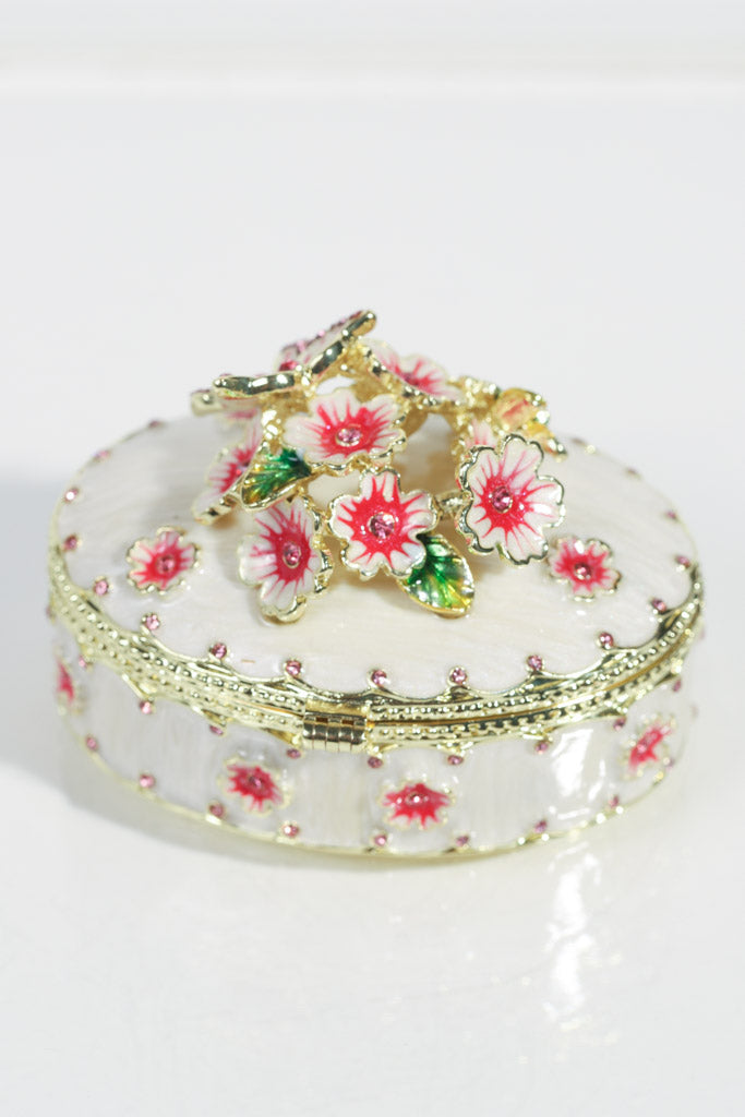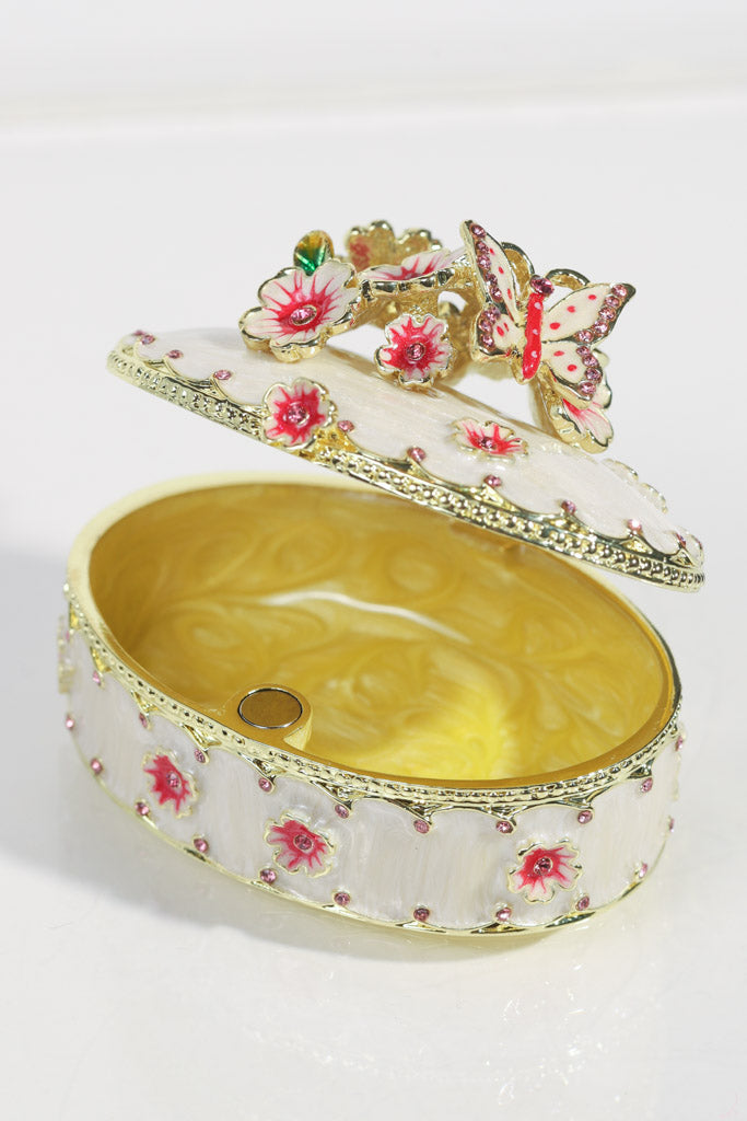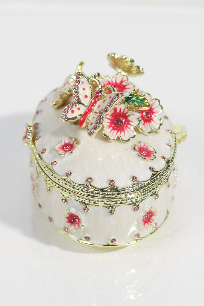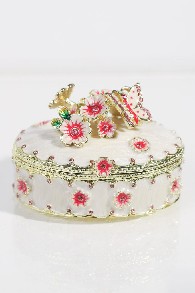 White Enamel Jewelry Box with Hot Pink Flowers and Butterfly