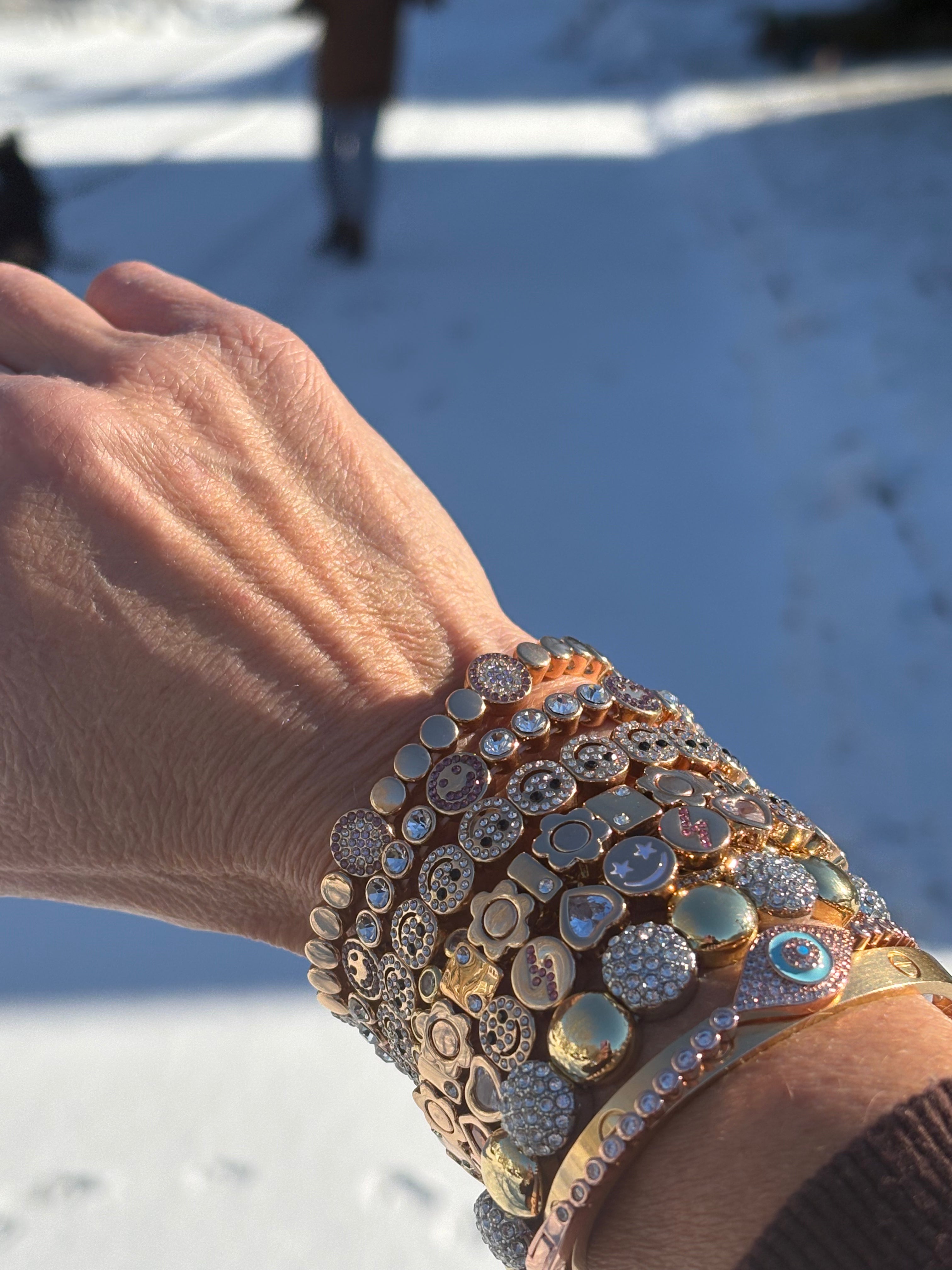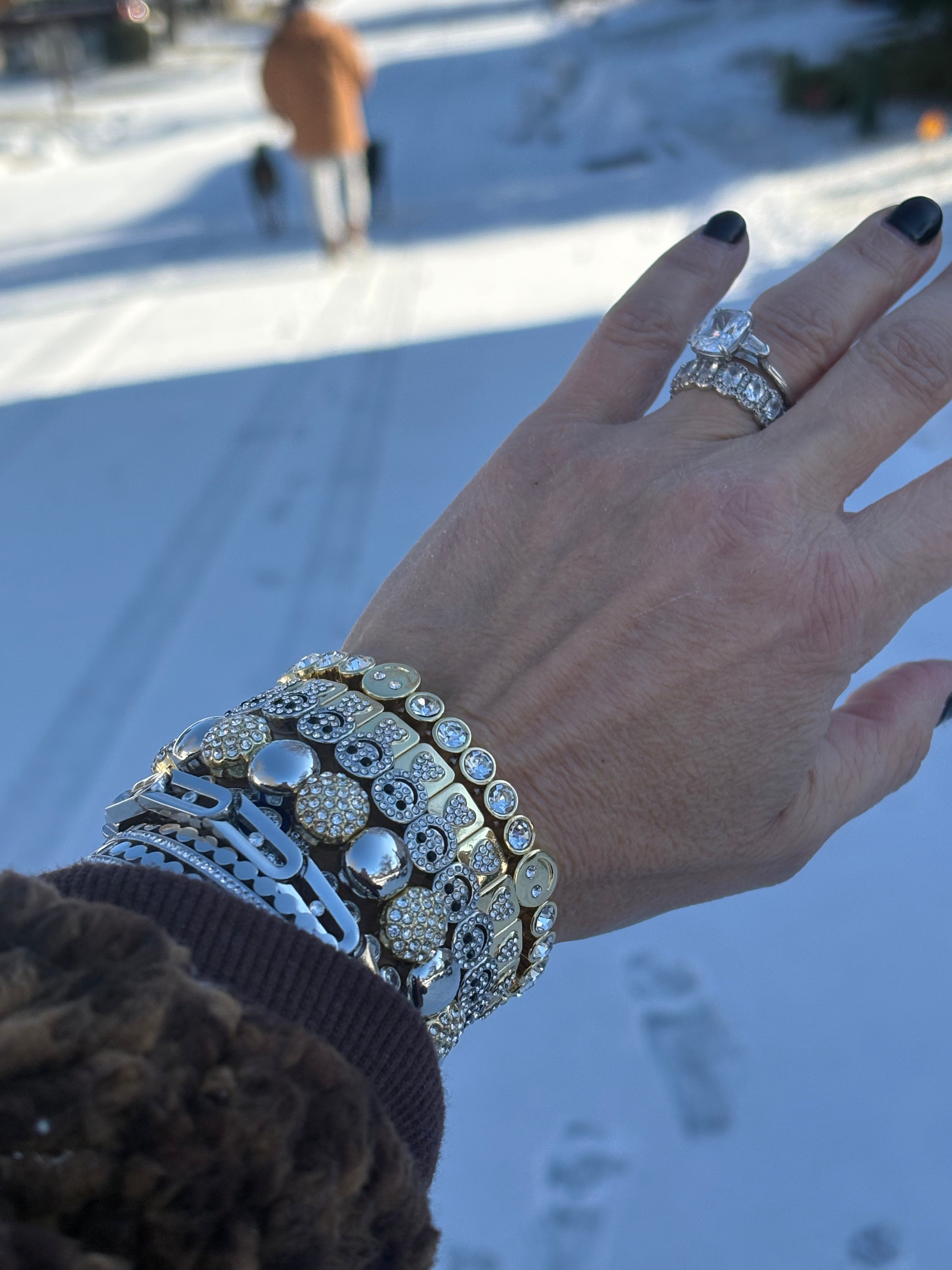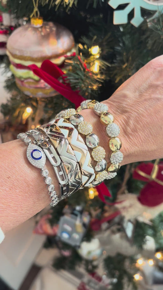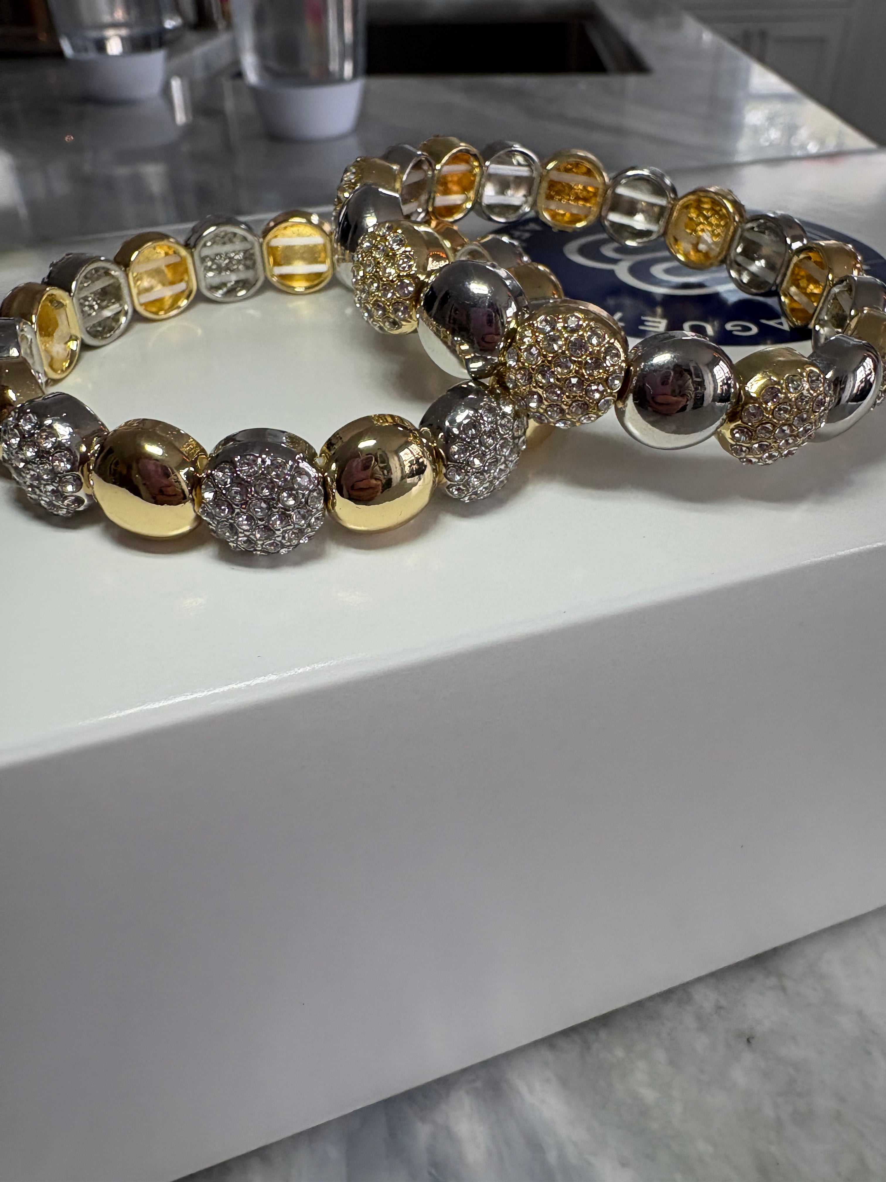 One bracelet has 14k gold balls mixed with silver crystal balls and the other bracelet has silver balls with 14k gold crystal balls. Fits wrists 6.5”-7.5”. Mixed metals are on trend and these bracelets are a gorgeous way to add both gold and silver into your stack. The sparkle is outrageous! You’re sure to get compliments!