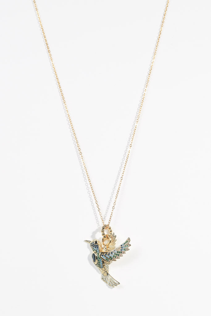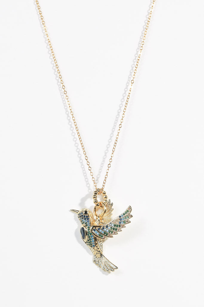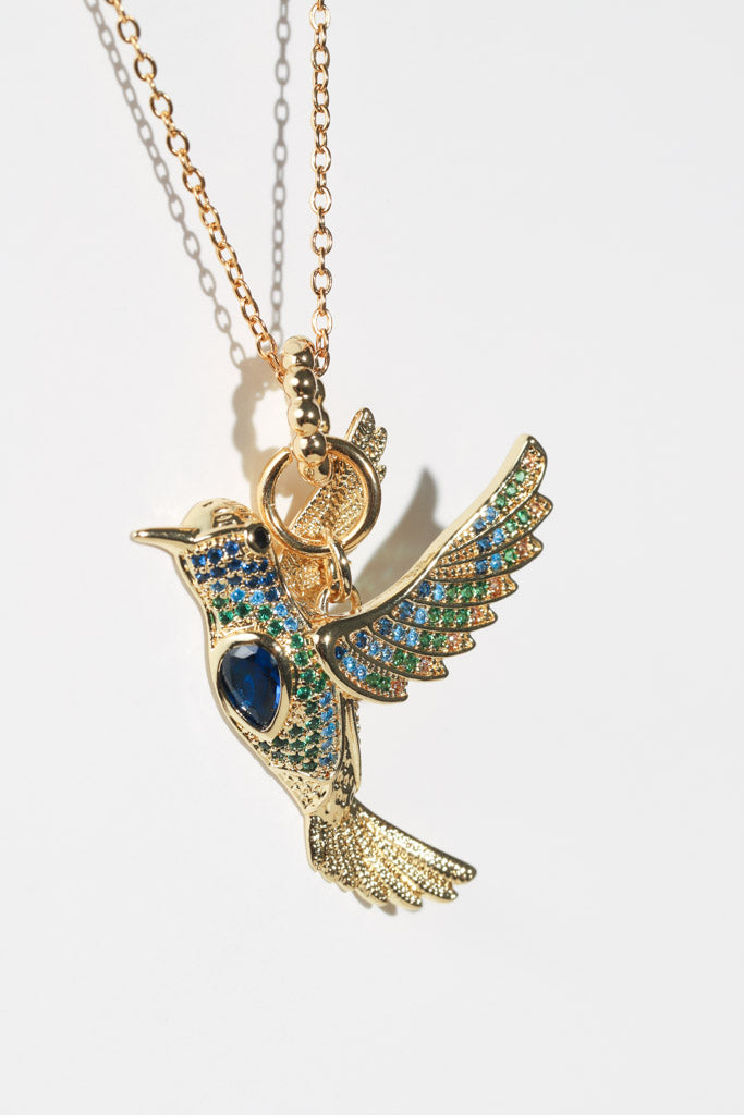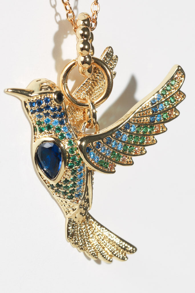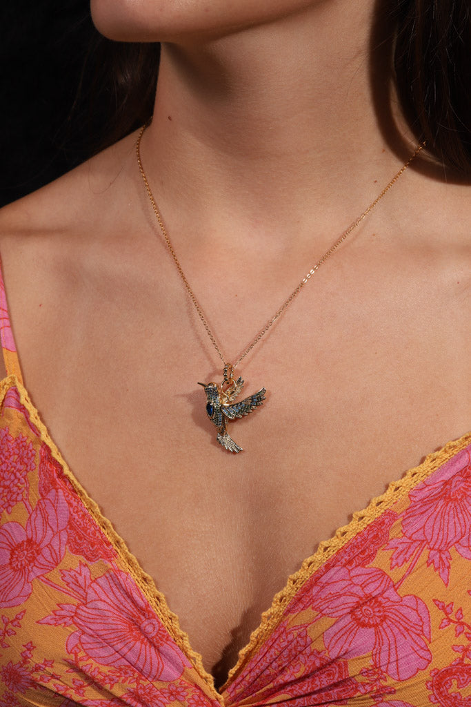 A true showstopper, this best-selling necklace features a striking hummingbird charm — a tribute to our company logo and a symbol of joy, freedom, and resilience. The charm, measuring approximately 2" tall, shimmers with blue and green crystals that catch the light beautifully from every angle. Suspended from a dainty 14k gold fill chain (16"-18"), this piece was designed to stand alone. Bold, elegant, and radiant, it makes a statement all on its own — no layering needed.