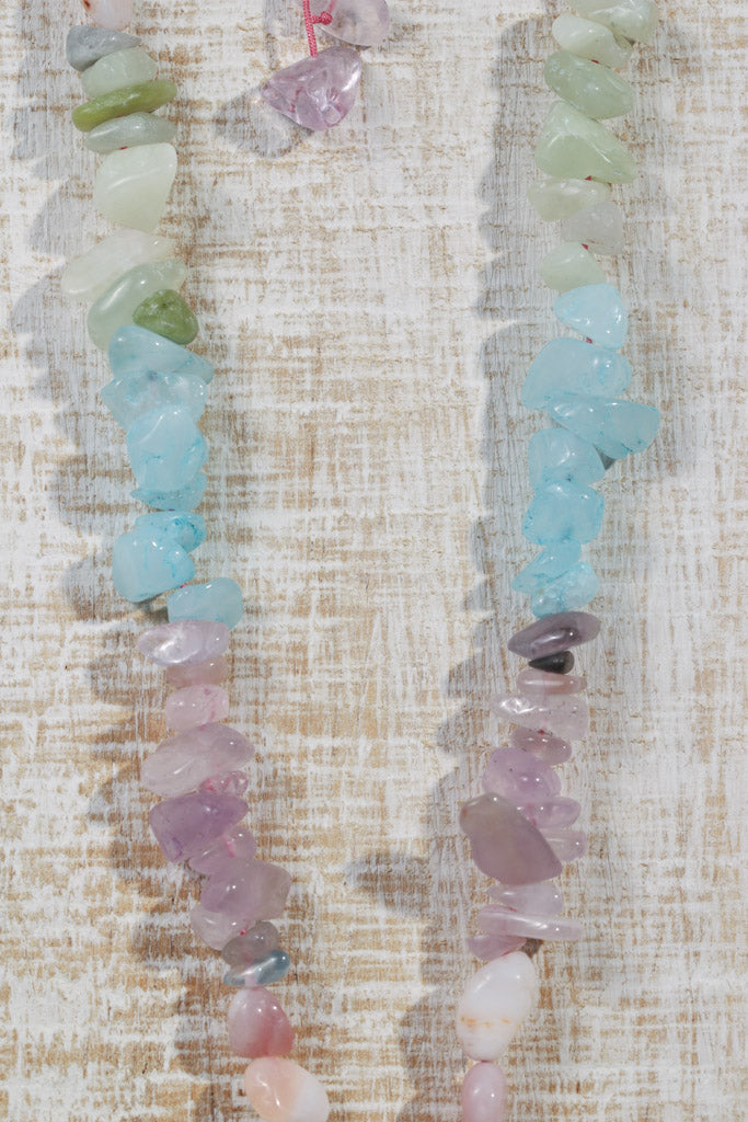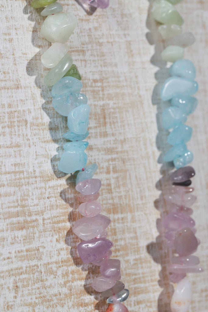 A little campy, a lot beachy, and absolutely adorable—this pastel beauty is a founder’s favorite. The necklace is hand-strung with an assortment of pastel stones, each one unique, in soft shades of pale pink, lavender, pastel turquoise, and mint green.
