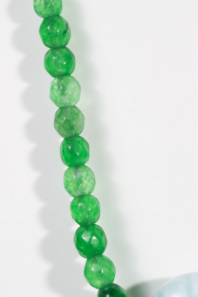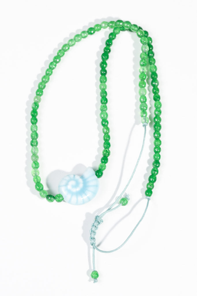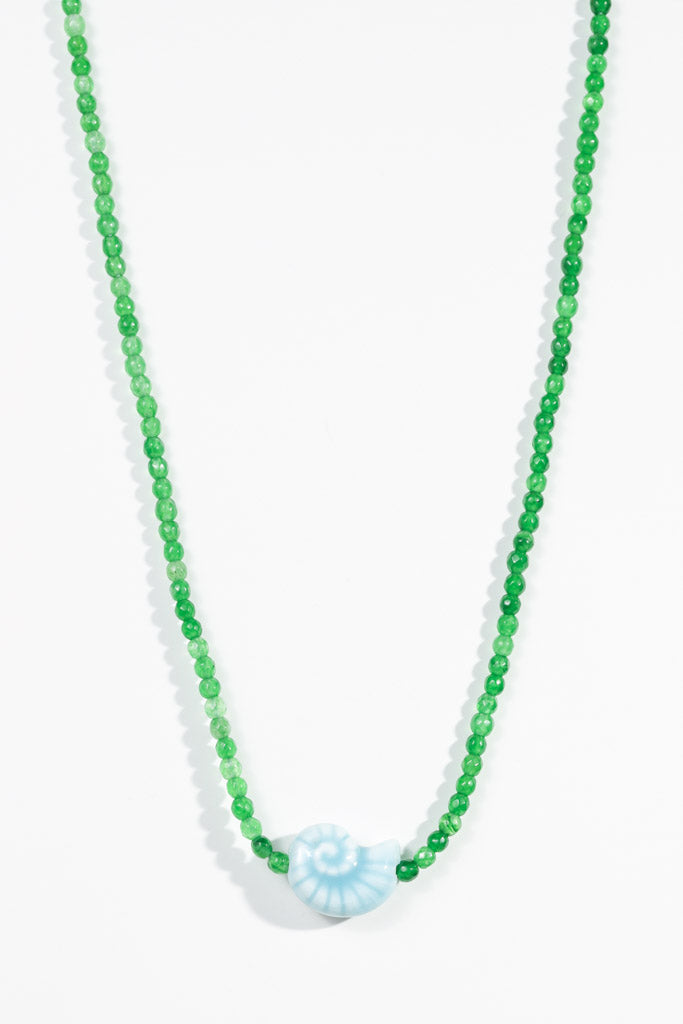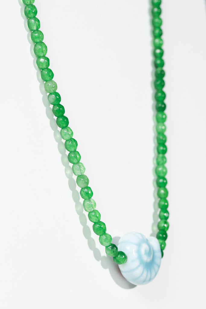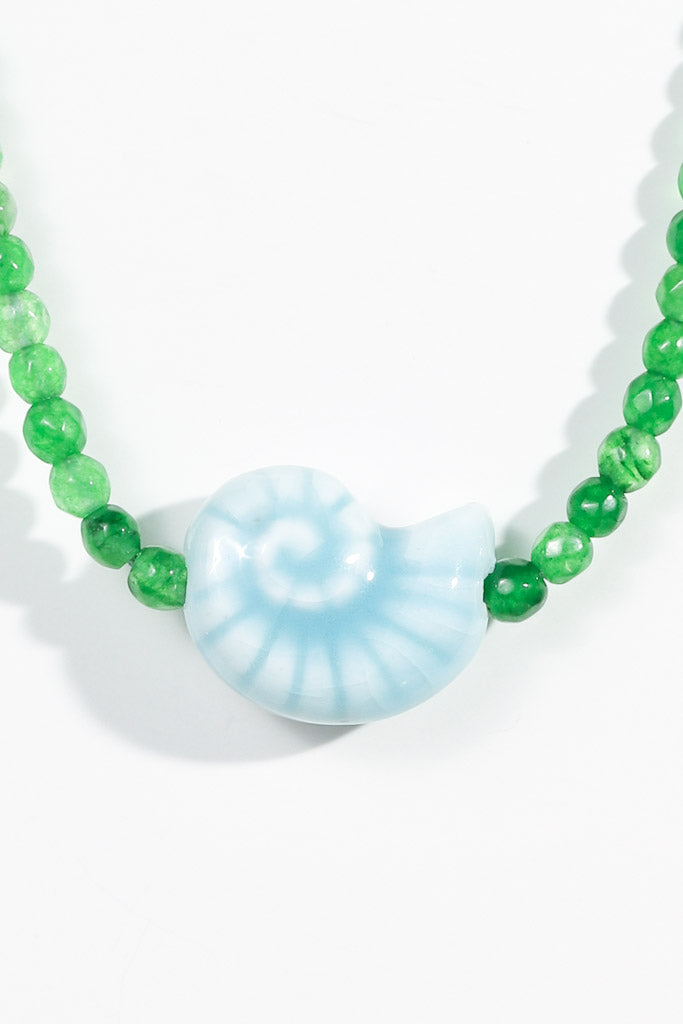 Bring a touch of coastal charm to your look with this handcrafted necklace featuring 3mm green glass beads and a delicate light blue porcelain shell accent. The adjustable macrame closure ensures a comfortable fit. Length can be adjusted from 16"–22", making it perfect for layering or wearing alone.