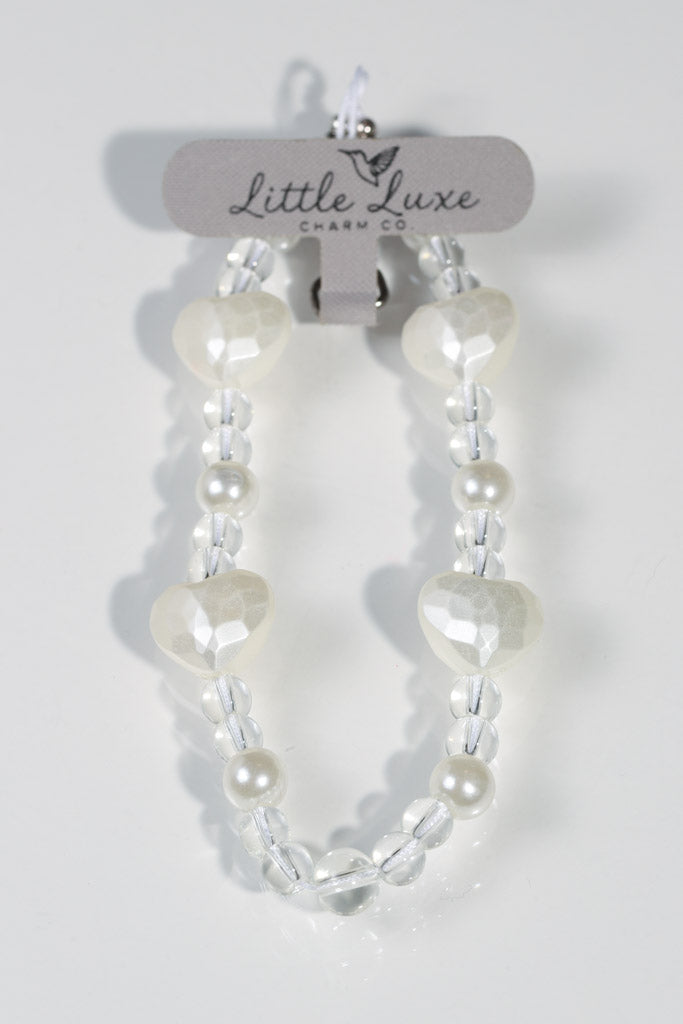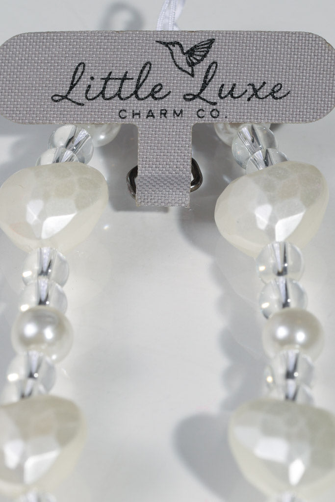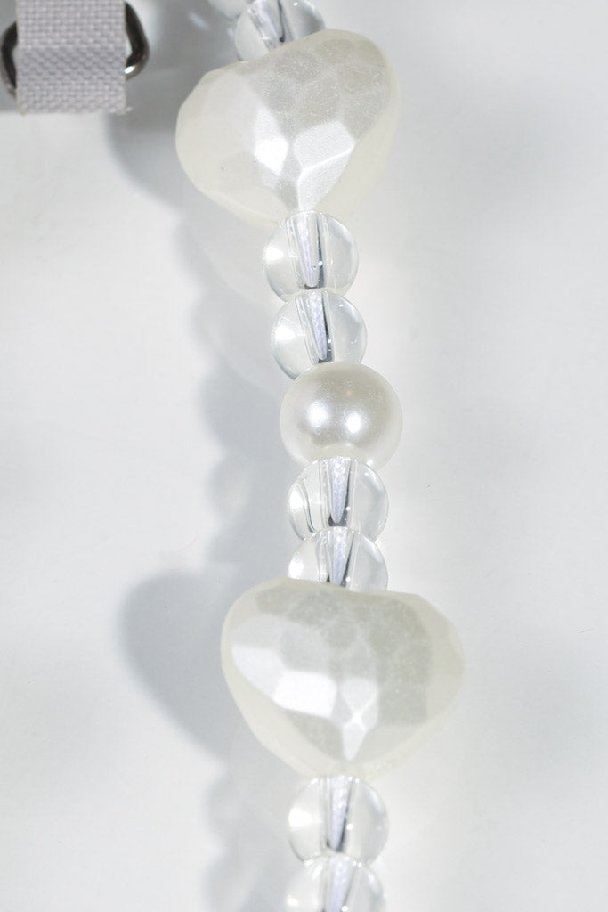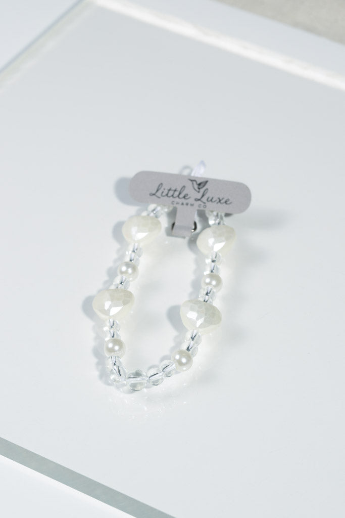 Handmade and effortlessly versatile, this clear beaded phone strap is designed to look like jewelry while keeping your phone safe and close. Strung with luminous clear beads, a touch of faux pearl accents, and finished with four large faceted pearlescent heart beads, it’s a chic accessory that goes with absolutely everything.