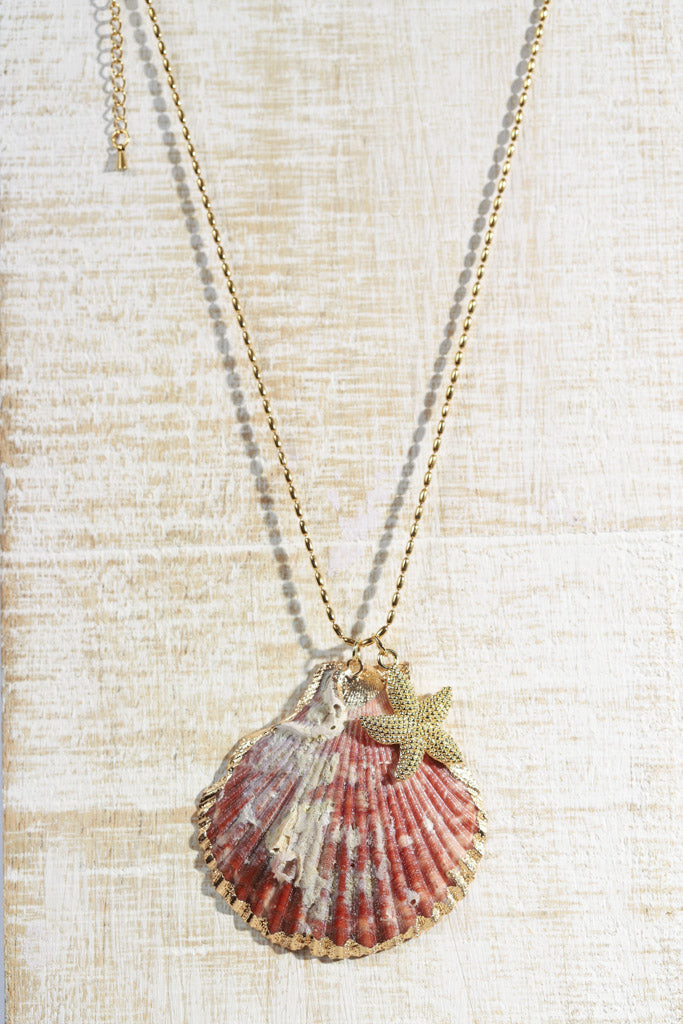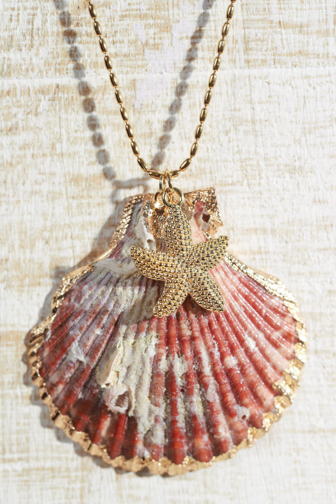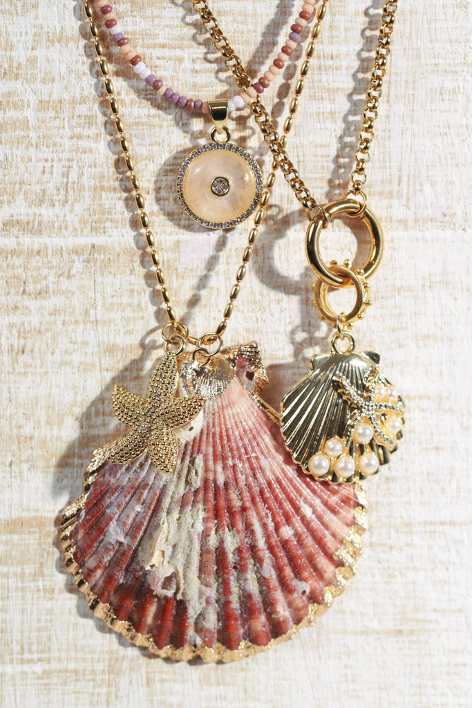 • Layer 1: A statement 18"-22" necklace featuring a rich brown authentic genuine shell trimmed in painted gold, resting on a 14k gold-filled rice bead chain. A gold beaded starfish charm floats delicately atop, adding depth and dimension.