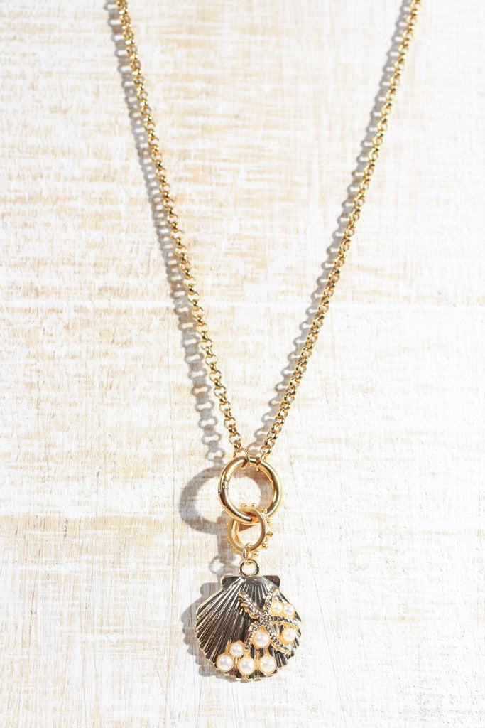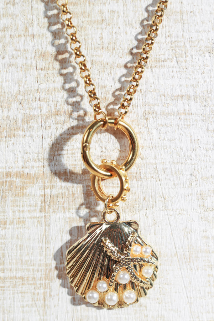 • Layer 3: An 18" chunky 18k gold fill charm chain finished with a pearl-adorned gold shell — bold yet breezy.