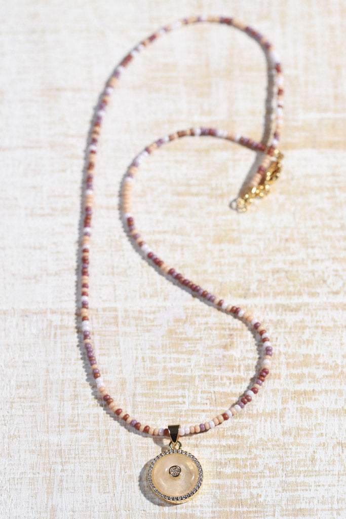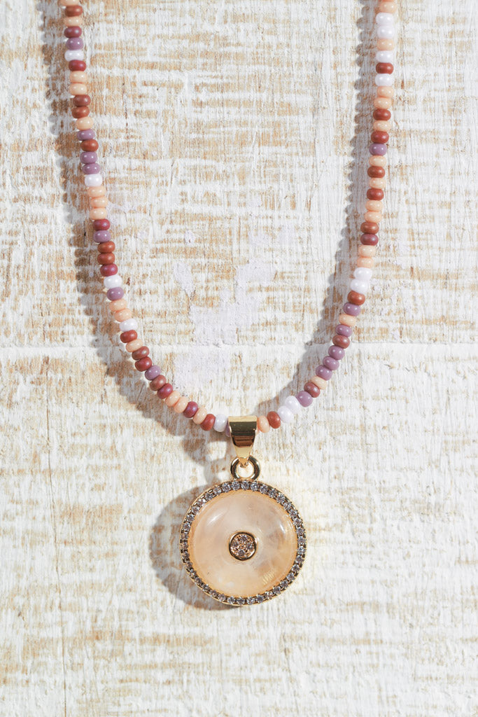 • Layer 2: A 16"-18" hand-strung seed bead strand in warm brown, peach, and cream hues, accented with a 14k gold-filled orange cat’s eye gemstone pendant surrounded by micro pavé CZ sparkle.