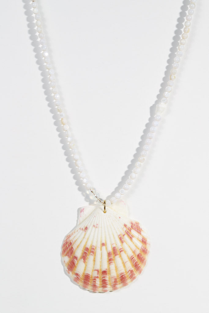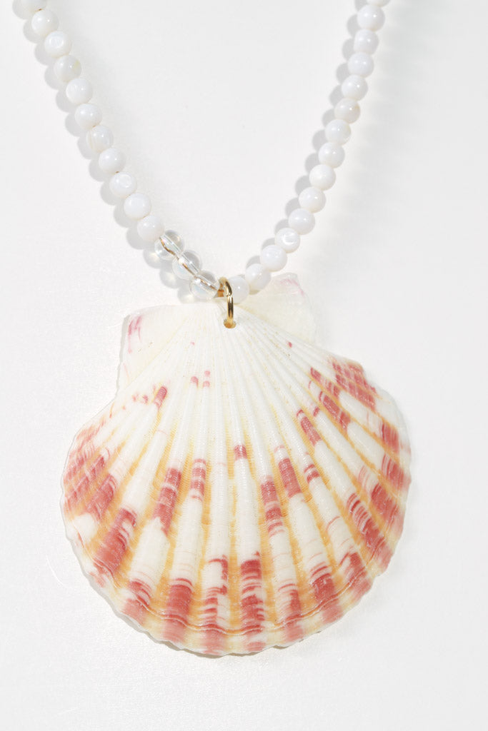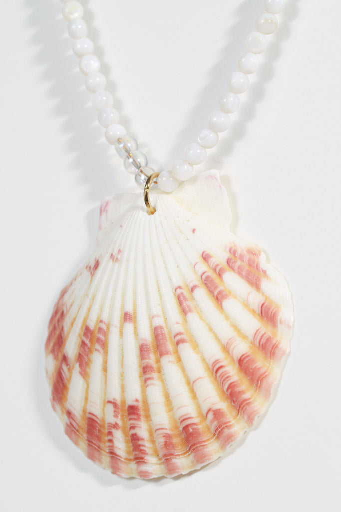 - Necklace Three (16") – A small white beaded necklace with a genuine orange-and-white shell pendant, accented by a tiny twisty shell bead woven into the strand to capture the essence of the sea.