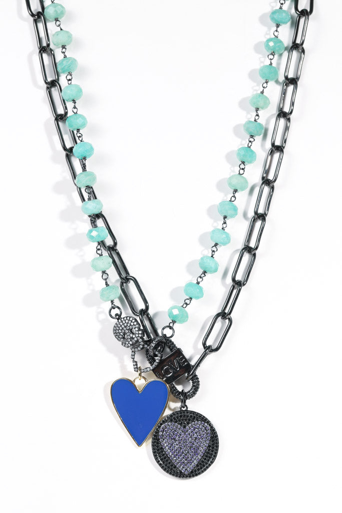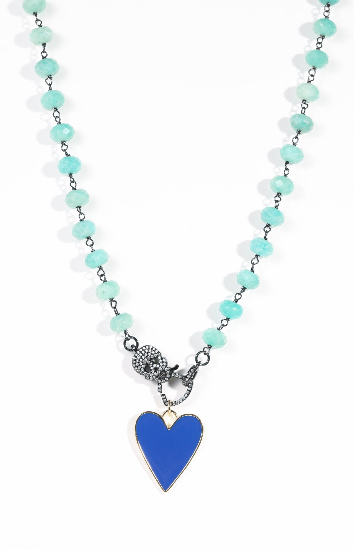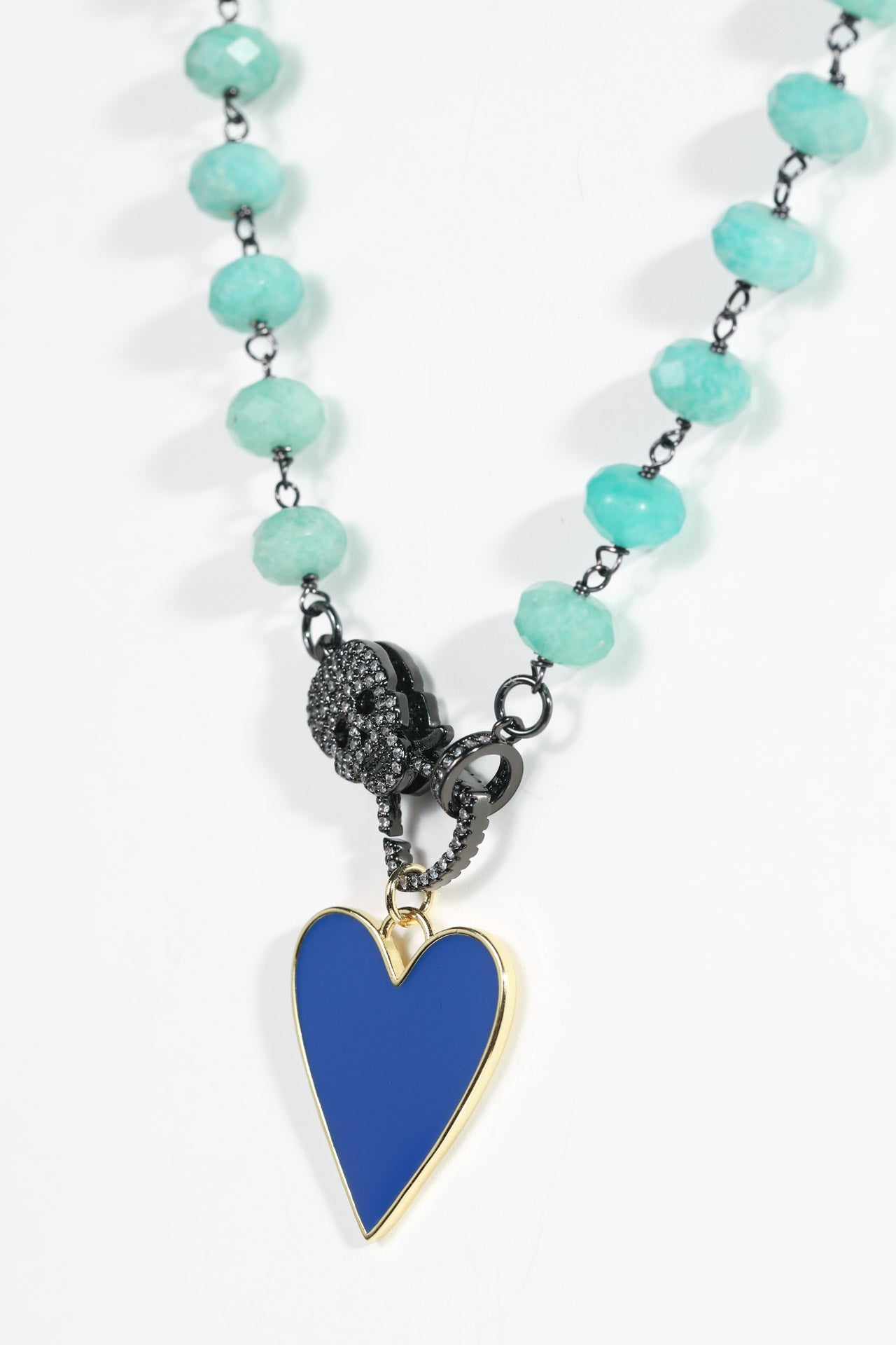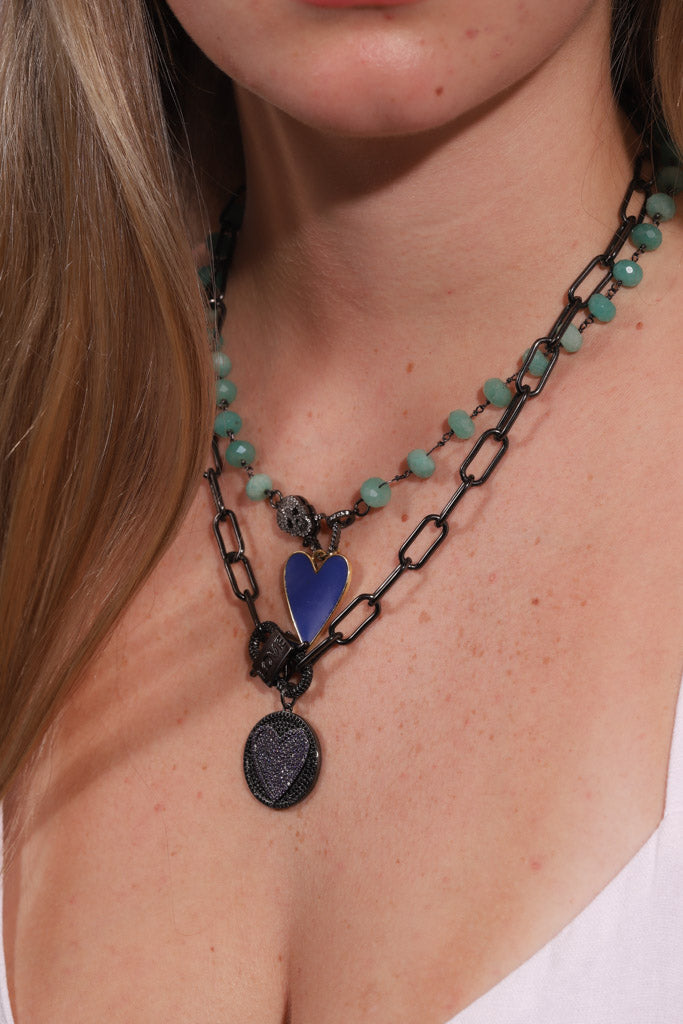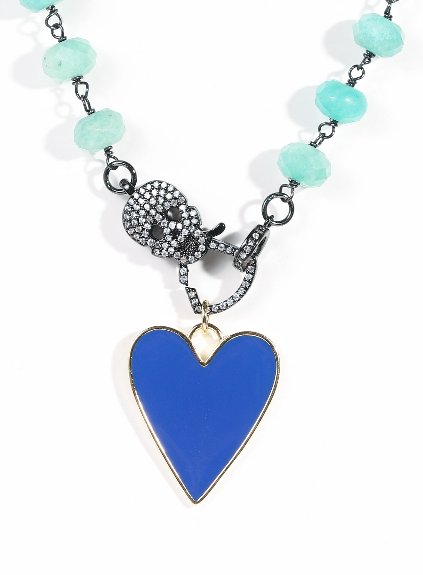 The first necklace features a strand of shimmering aqua-colored stones, finished with a pavé crystal skull clasp that adds a touch of edgy sophistication. Dangling from the clasp is a striking navy enamel heart charm, creating a modern balance of elegance and statement style. Measuring 16", it sits perfectly at the collarbone.