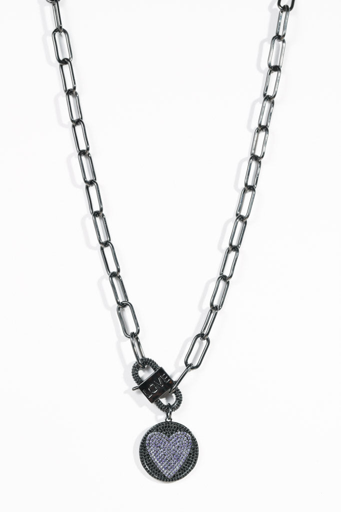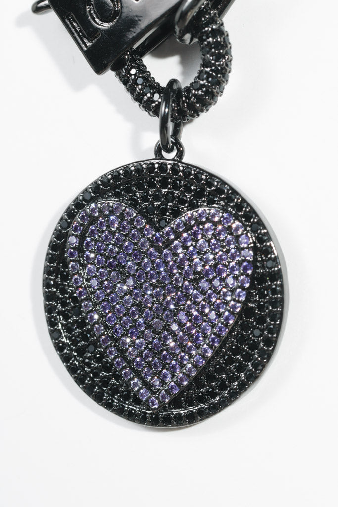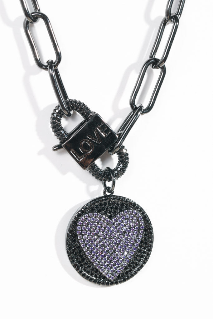 The second layer is a black metal paperclip chain (18"–20"), finished with a sleek black clasp inscribed with “LOVE.” From the clasp hangs a pavé black crystal disc, accented with a large lavender pavé crystal heart at its center. This combination of deep tones and sparkling details adds depth and contrast to the look.