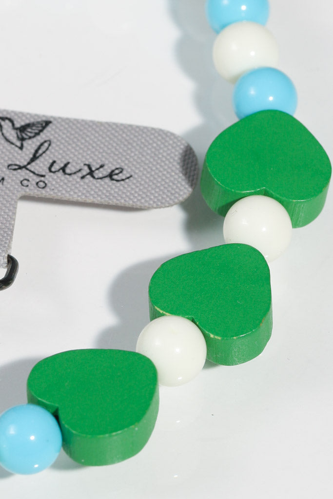 - Handmade beaded phone strap with wooden heart accents