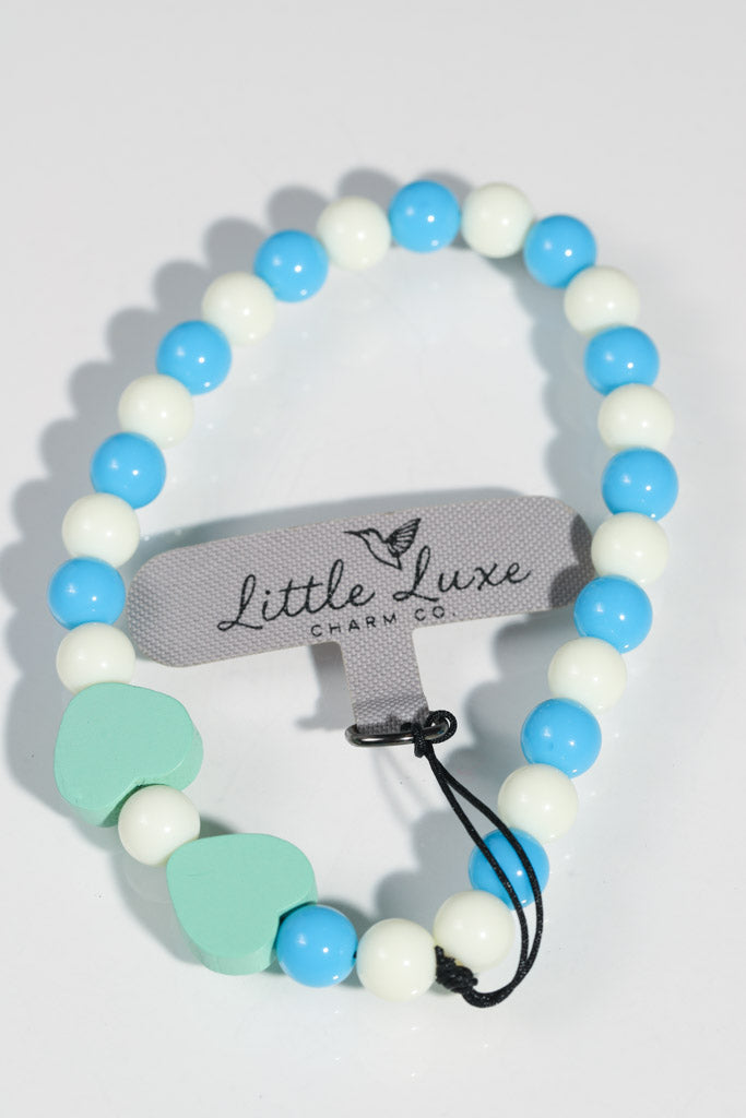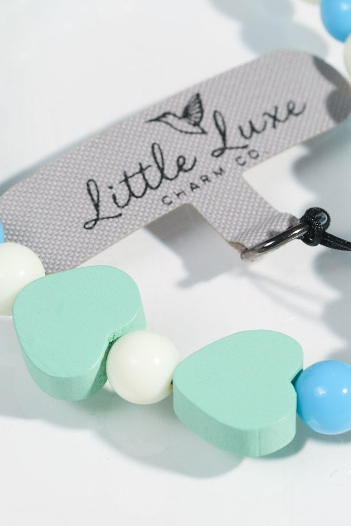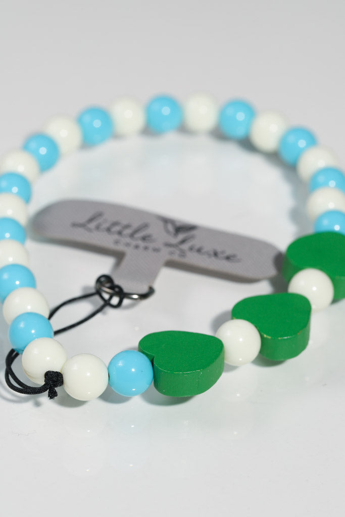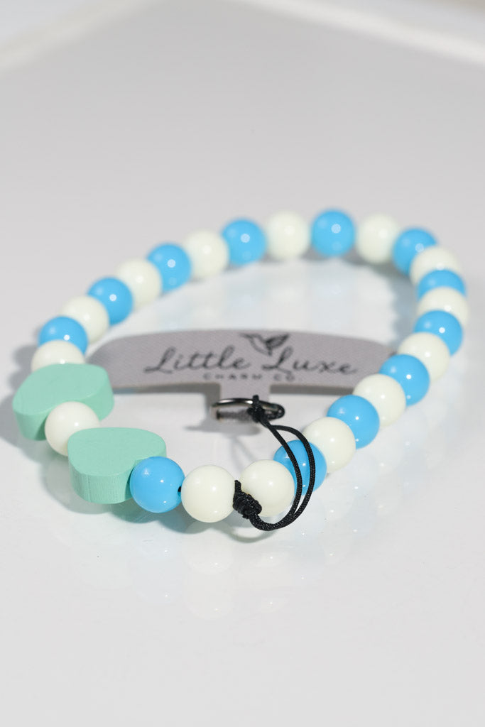 - 💙 Blue & White Beads + 2 Mint Green Wooden Hearts – fresh and modern