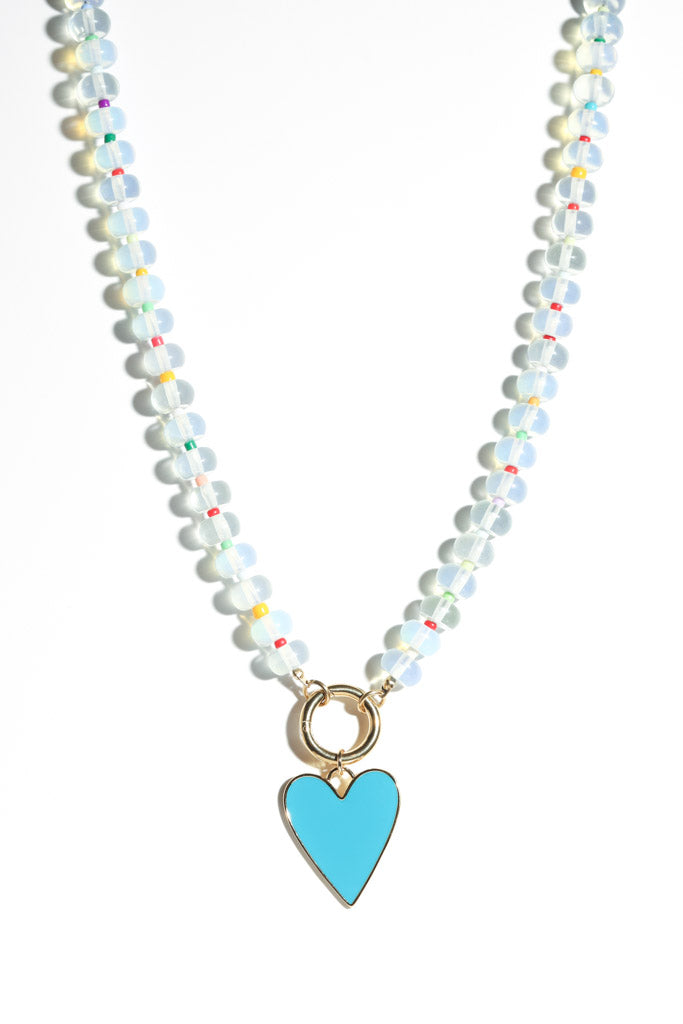 Delicate, sparkly, and full of color — this necklace is the perfect mix of subtle and statement. It features larger clear beads accented with tiny pops of color throughout and a circular gold charm clasp that holds a turquoise enamel heart charm trimmed in gold.