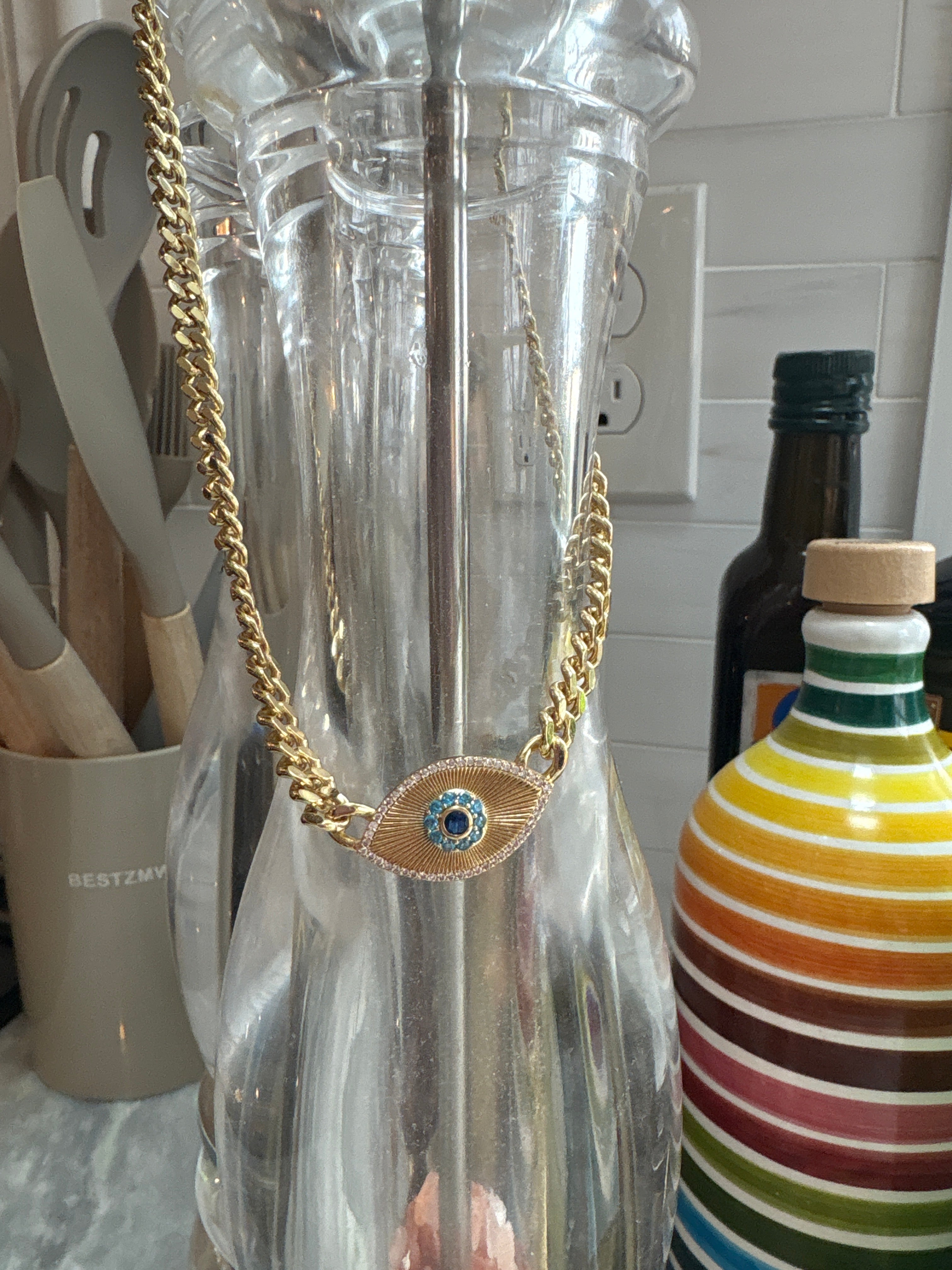 14k over stainless steel; won’t rust or tarnish.  It’s excellent quality.  Feels luxe without the luxe price tag.  18”-22” long with extender chain.  Evil eye has pavé crystals outlining the pendant and the eye itself.  It’s a piece you’ll have forever.  Who doesn’t need protection from negative energy?!