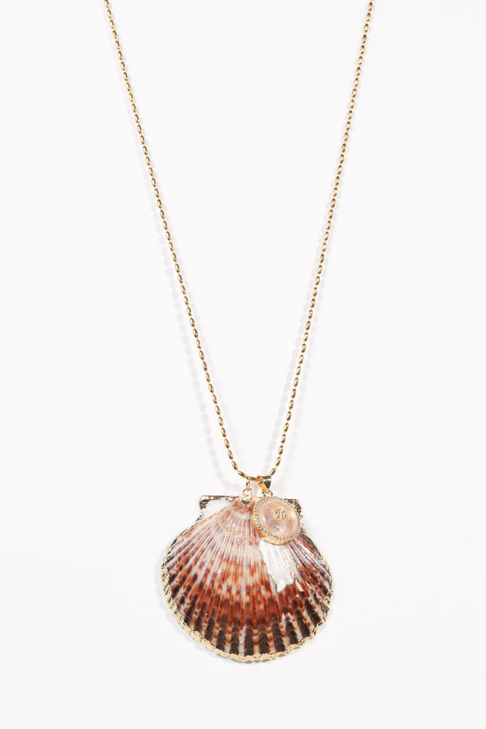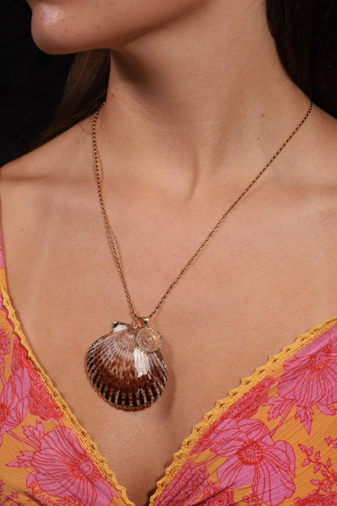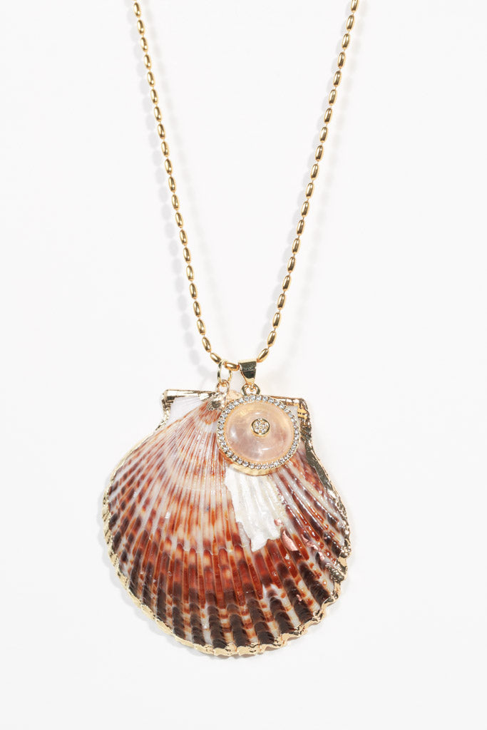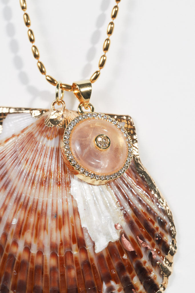 This one-of-a-kind necklace combines natural beauty with luminous sparkle. A large genuine brown shell, edged in rich gold, pairs effortlessly with an orange cat’s eye gemstone charm in a donut shape, surrounded by a halo of pavé crystals that catch the light with every movement. The charms hang from a 14k gold fill rice bead chain (18") — sturdy yet dainty enough to showcase the statement-making pendants without distraction.