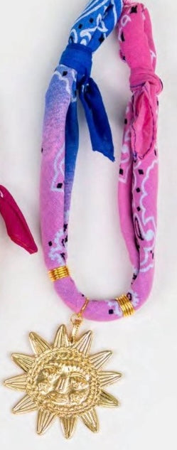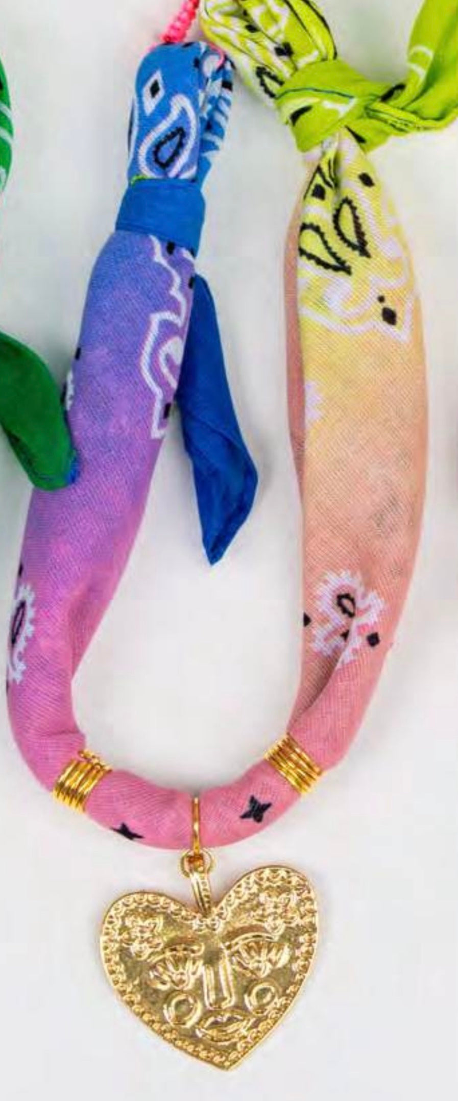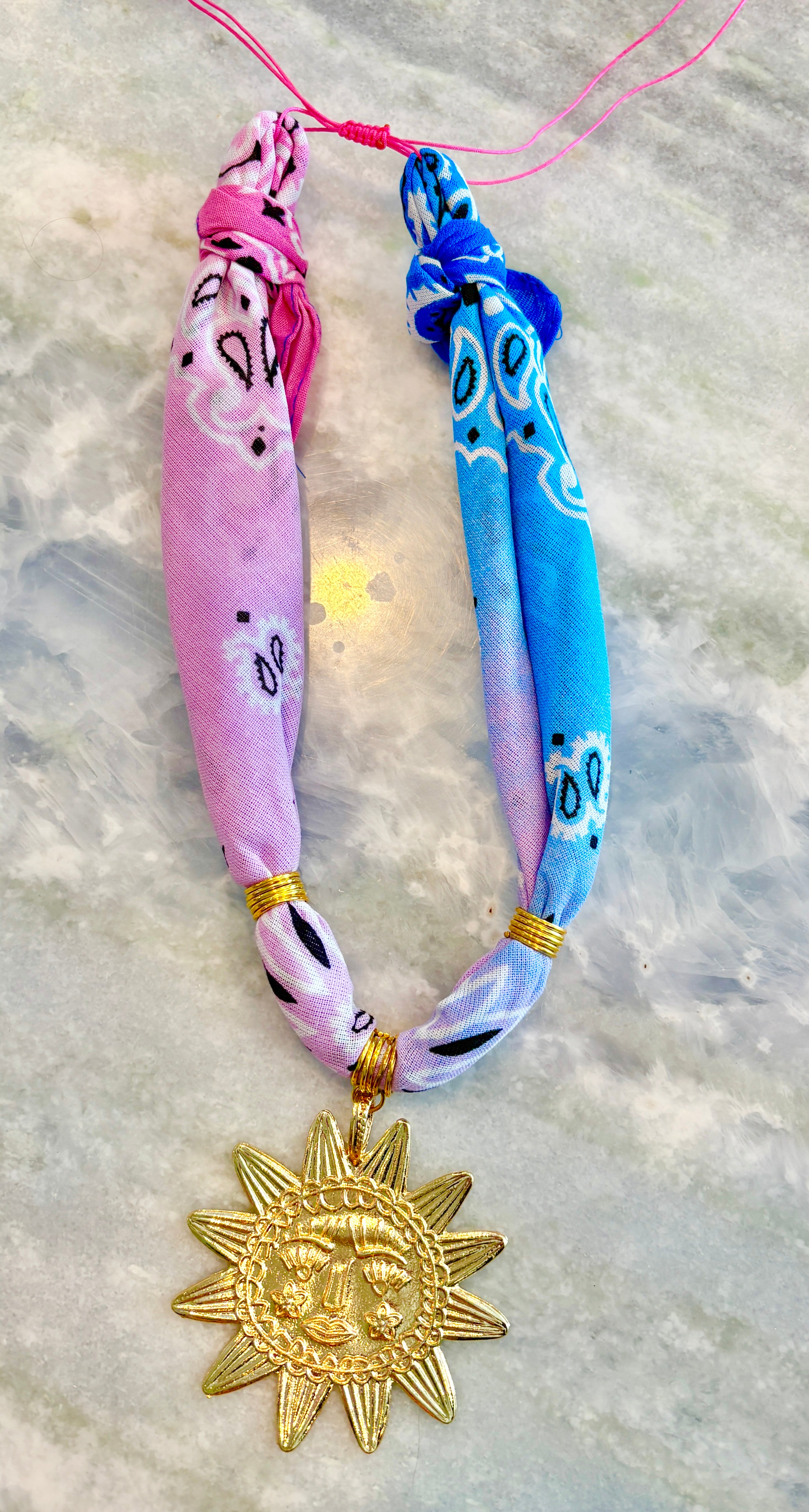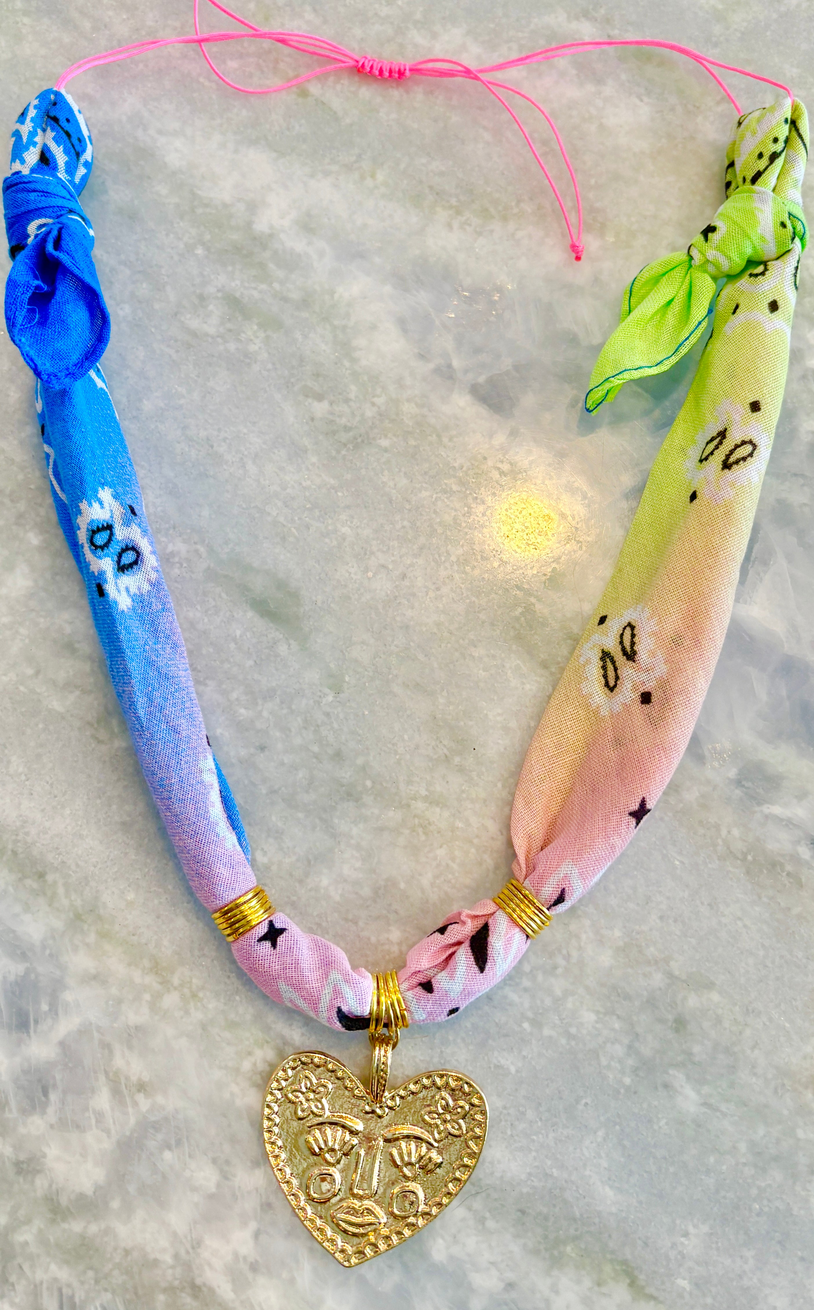 Hand dyed tie-dye bandanna scarf necklace. One has a statement heart pendant with a cute face embossed into the metal. The other necklace has a statement sun pebdant with a cute face embossed into the metal.