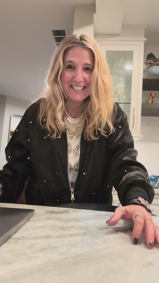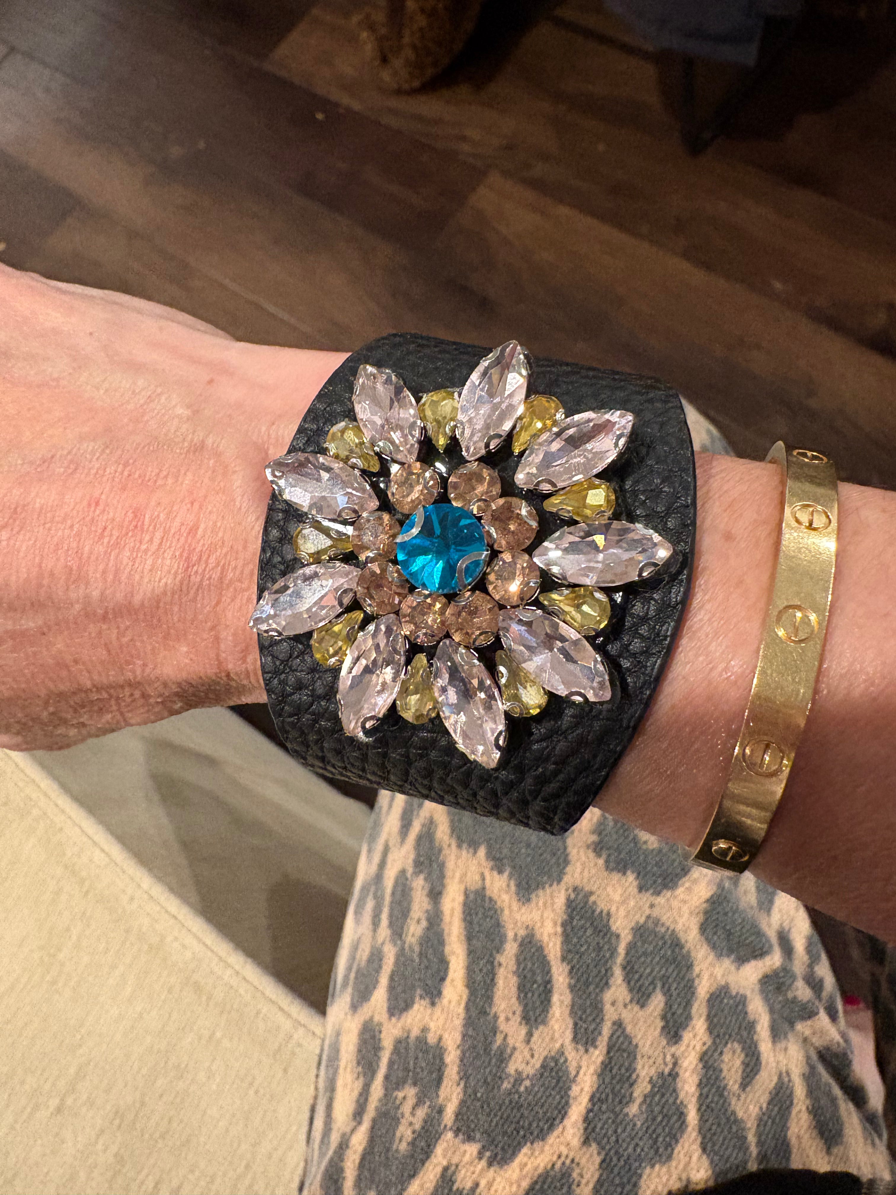 Faux leather jeweled bracelet. It’s so sparkly! Would look amazing with a black dress, sleeveless blouse, a white tank and jeans. This is the kind of bracelet you don’t need anything else. It’s edgy, cool and a Little Rock n’ roll. Don’t be afraid to sparkle and stand out! Fits wrists 6.5”-8.5”. The leather is a soft buttery pebbled leather. It molds to your wrist. It’s not hot or heavy. The perfect accessory for the fashionista.