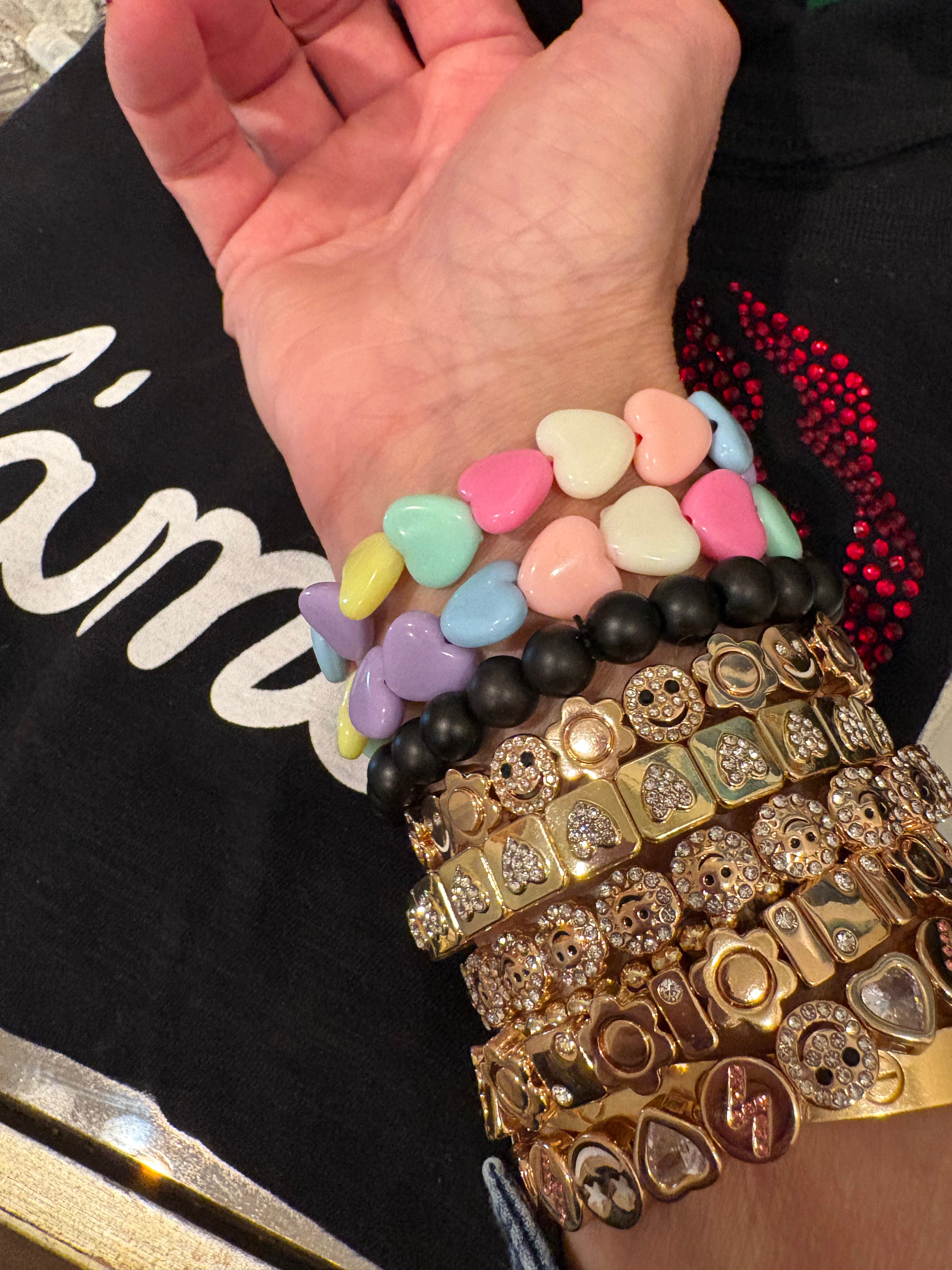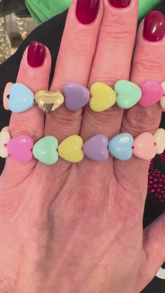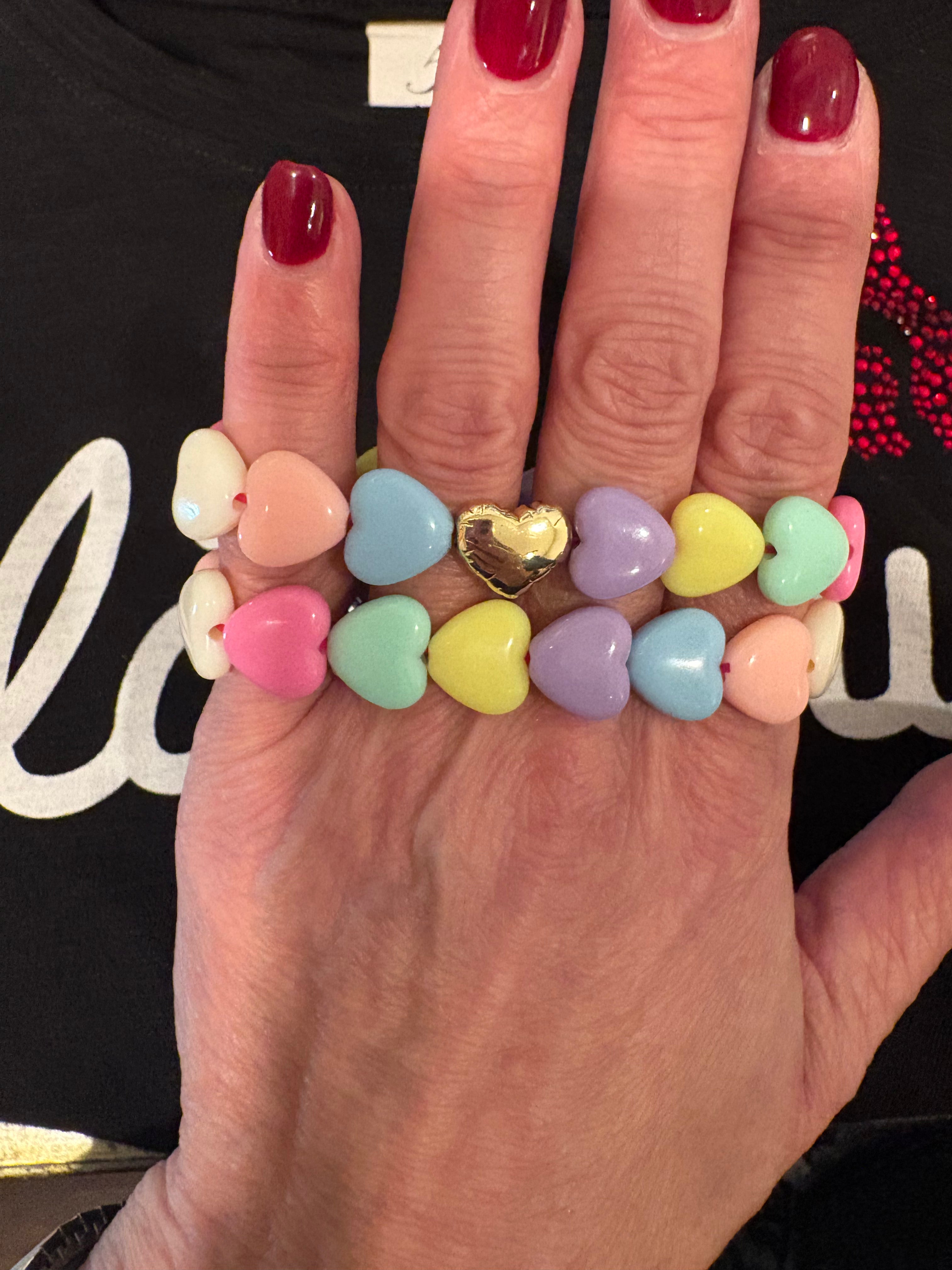 Pastel heart stretch bracelets.  One has a 14k gold fill heart in the center.   The other bracelet is the pastel hearts without the gold heart in the center.   They are so fun and whimsical.  Jewelry is meant to be fun!   Fits wrists 6.5”-7.5”
