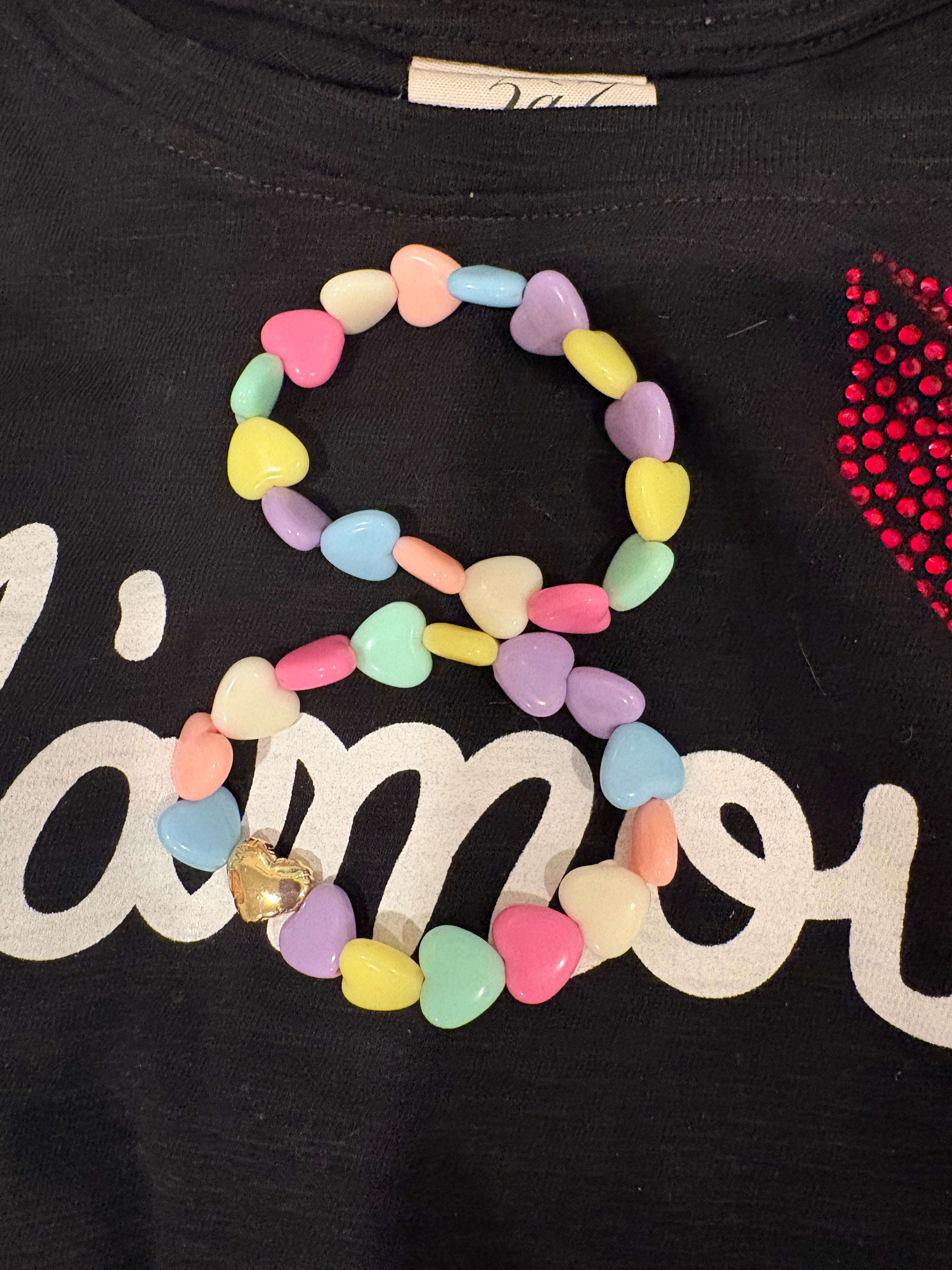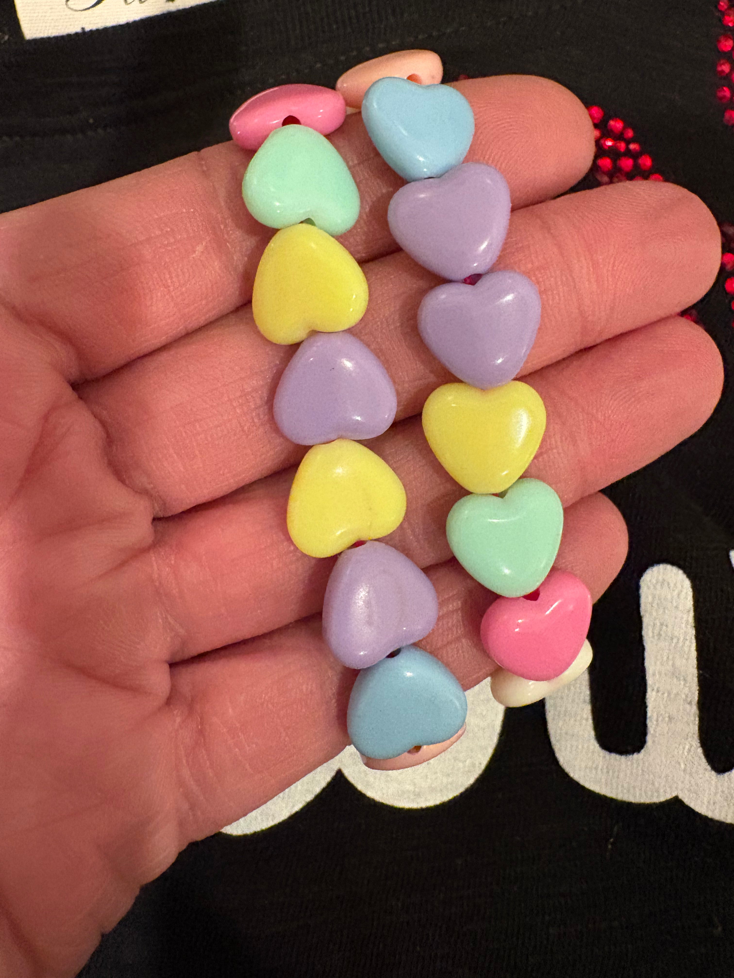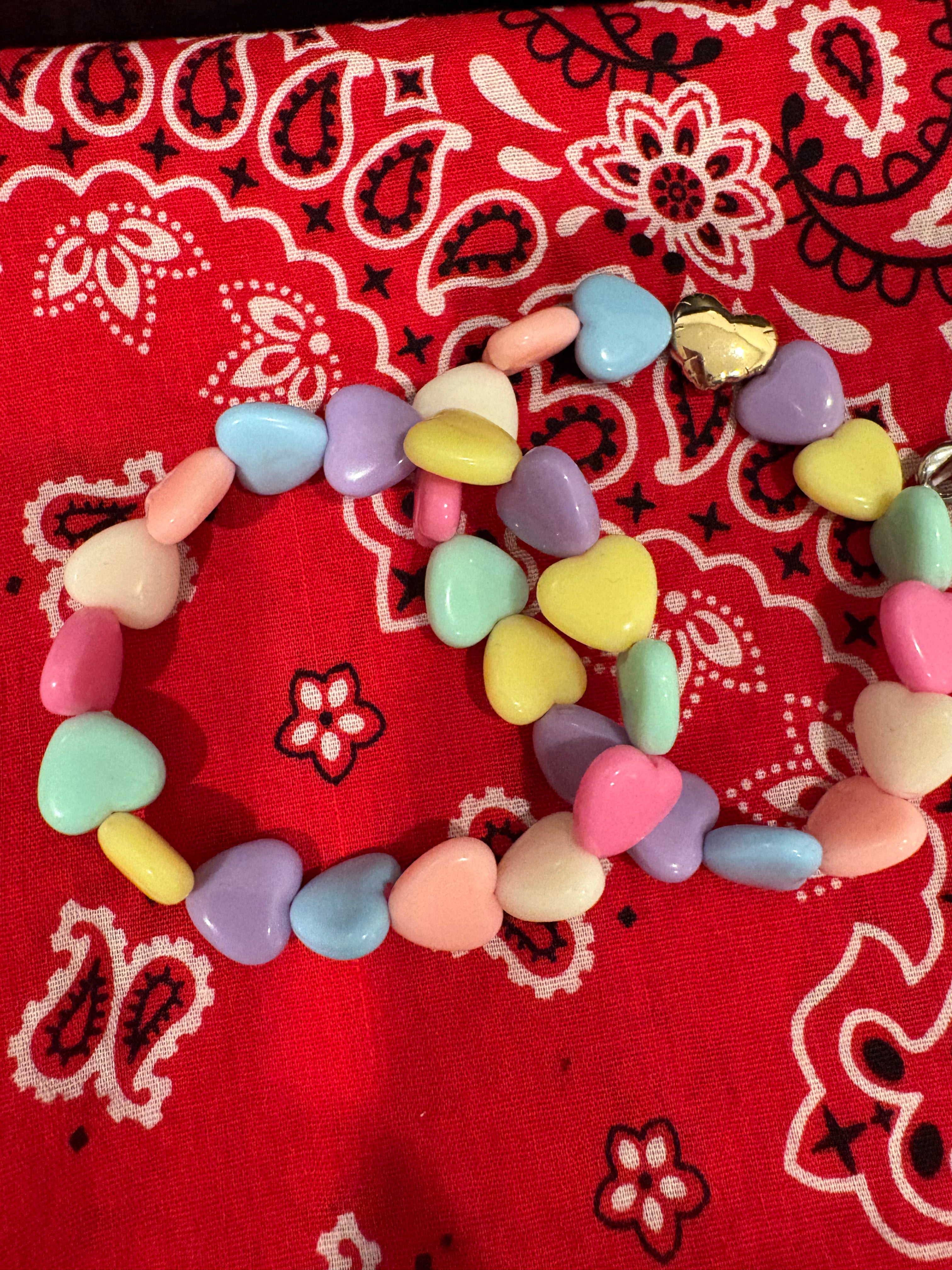 Pastel heart stretch bracelets.  One has a 14k gold fill heart in the center.   The other bracelet is the pastel hearts without the gold heart in the center.   They are so fun and whimsical.  Jewelry is meant to be fun!   Fits wrists 6.5”-7.5”