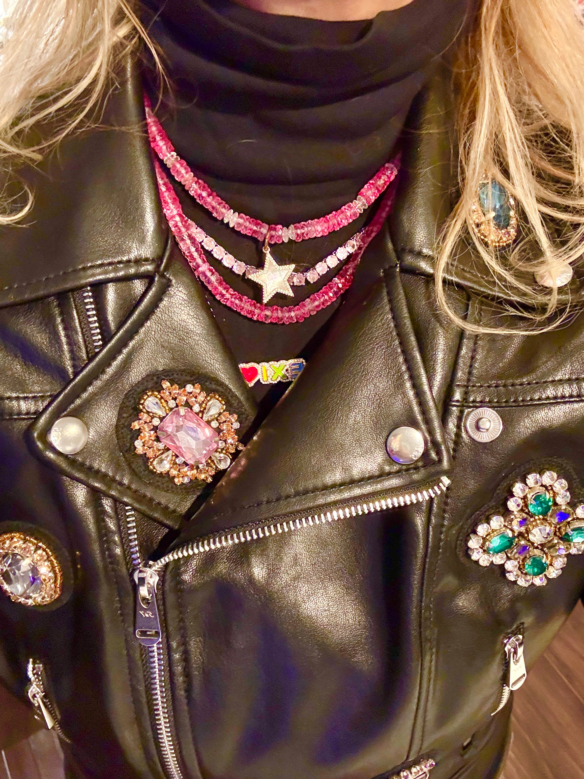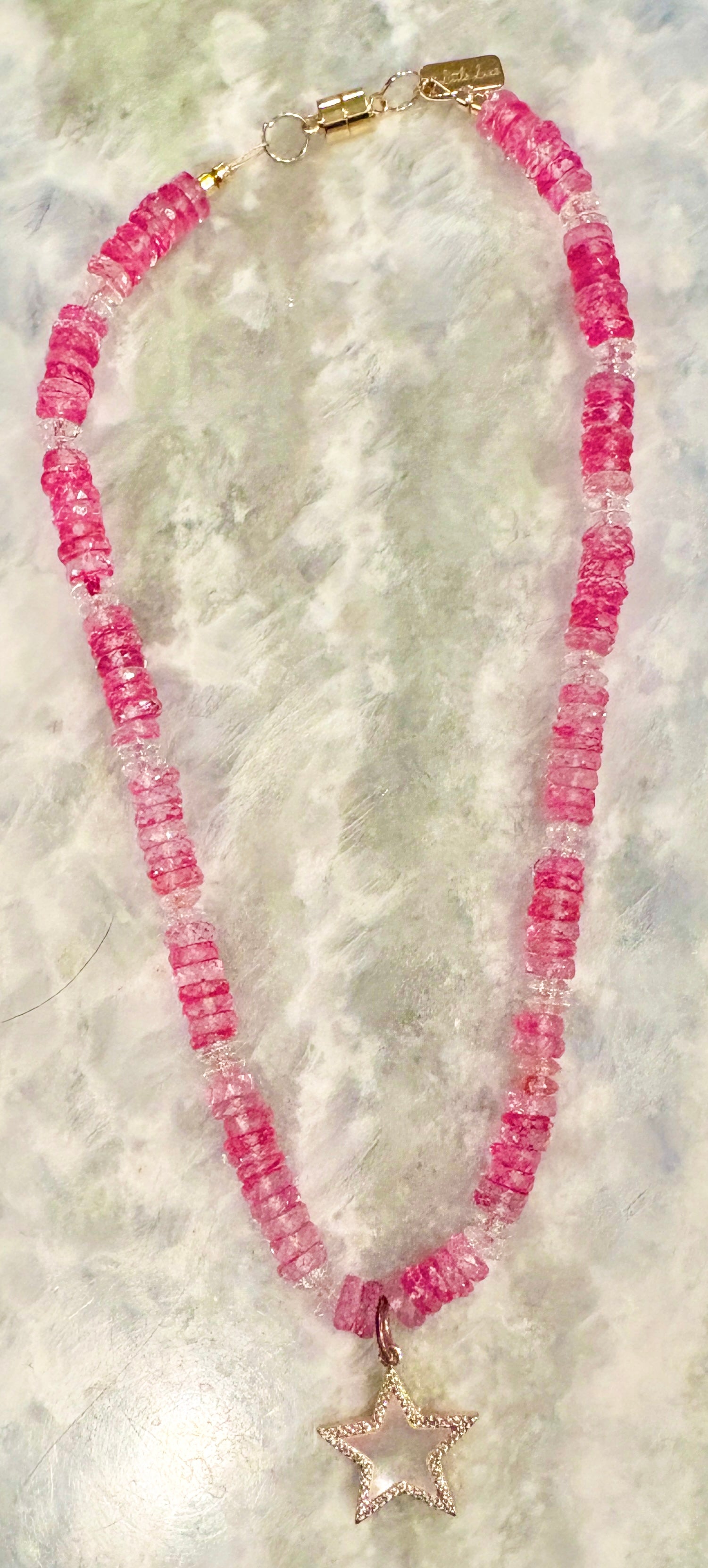 The first necklace has fuschia and clear sliced opals with a beautiful mother of pearl star charm outlined in clear crystals, measuring approximately 16”. For easy on and off, there is a 14 k gold fill magnetic clasp.