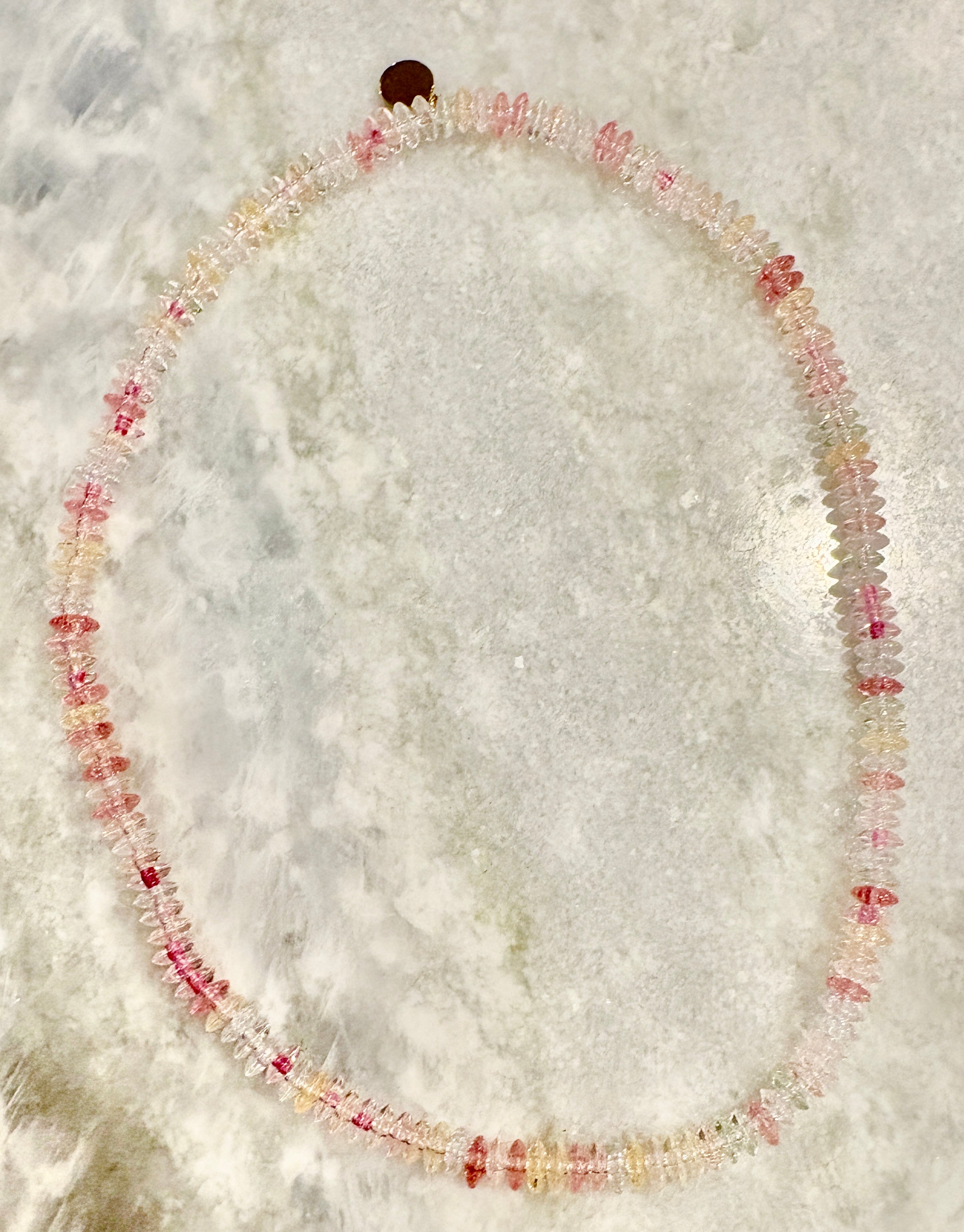 The third necklace in the set is a stunning, sliced opal choker measuring 15 inches in beautiful shades of pastel pink, dark pink, pale yellow, and clear. The necklace is hand dyed, made with Japanese elastic for easy on and off. It’s Extremely light weight and very comfortable to wear as a set or by itself.