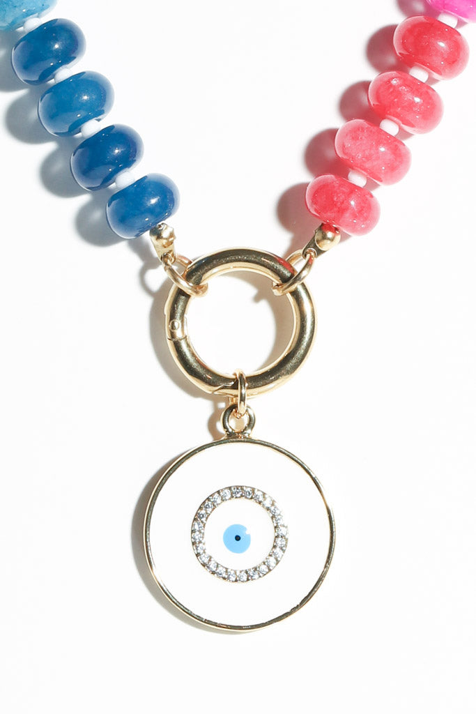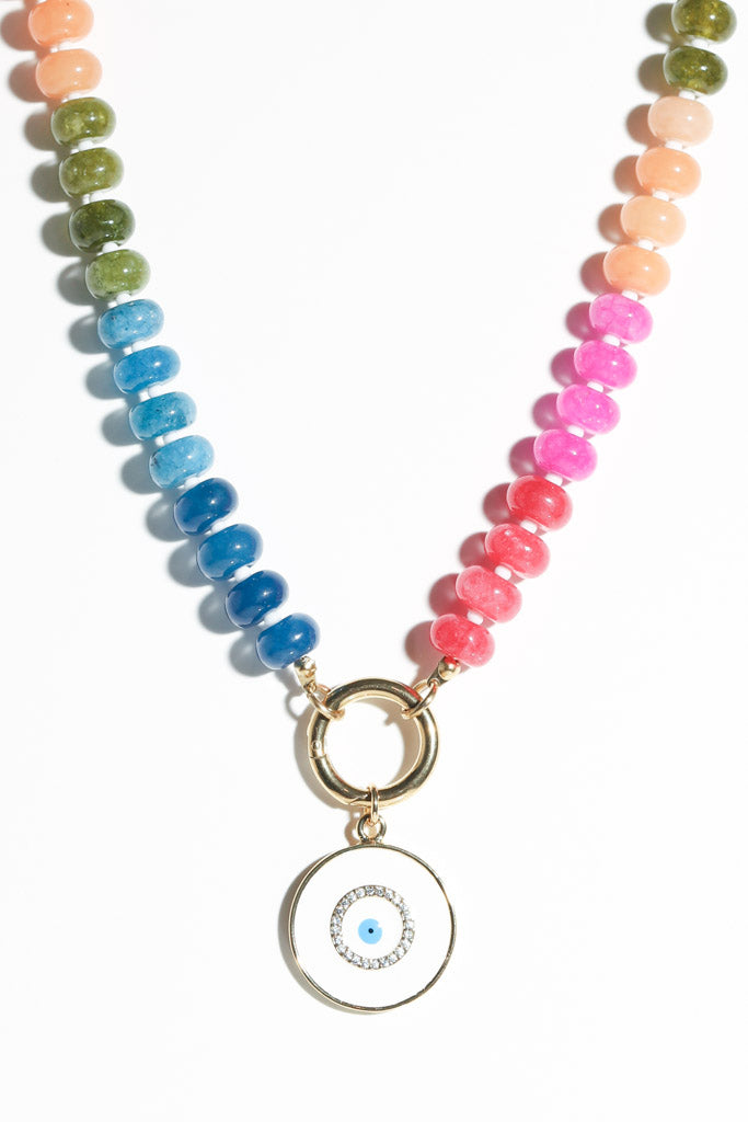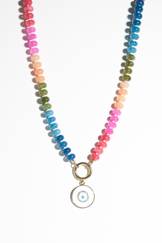 Bright, fun, and full of good vibes — this colorful beaded necklace is your new go-to for adding a pop of personality. Hand-strung with rainbow-hued beads and finished with a circular gold charm clasp, it features a white and blue enamel evil eye charm for a little extra sparkle and protection.