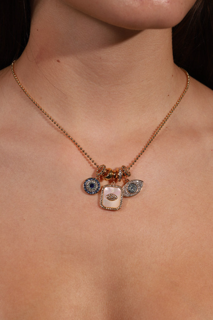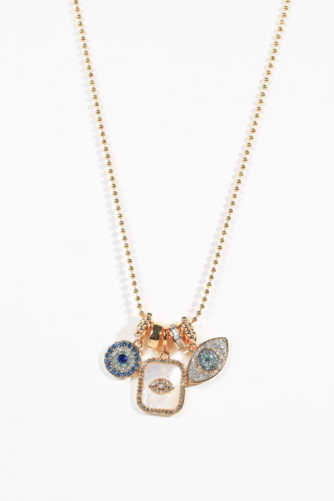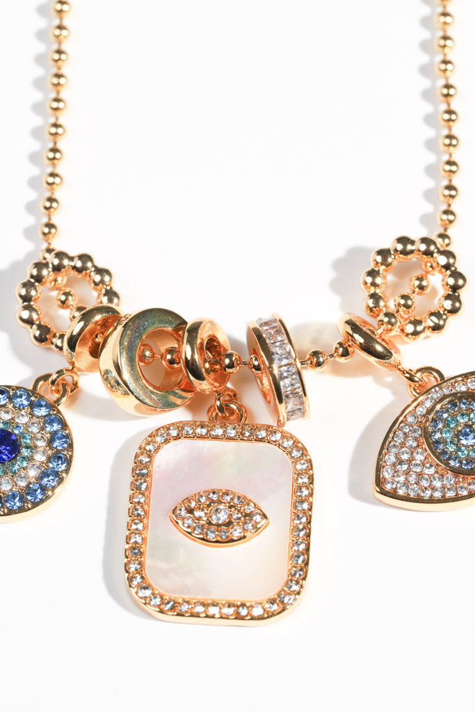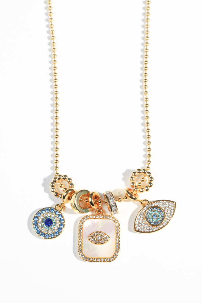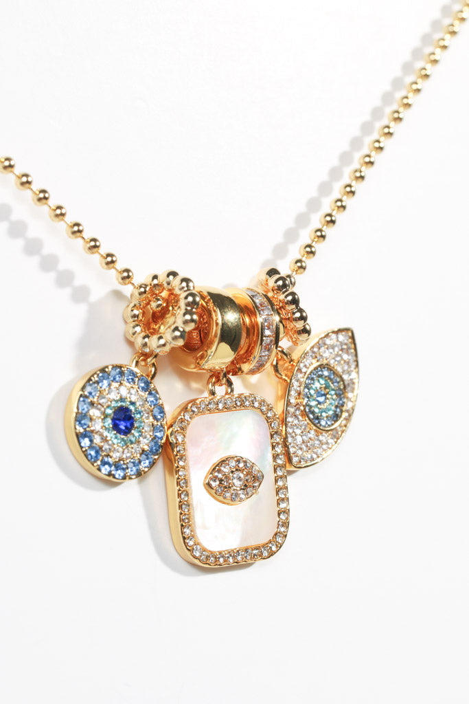 Three striking evil eye charms—two clear and blue crystal charms flanking a center mother-of-pearl crystal charm—are strung along a gold-plated beaded chain.